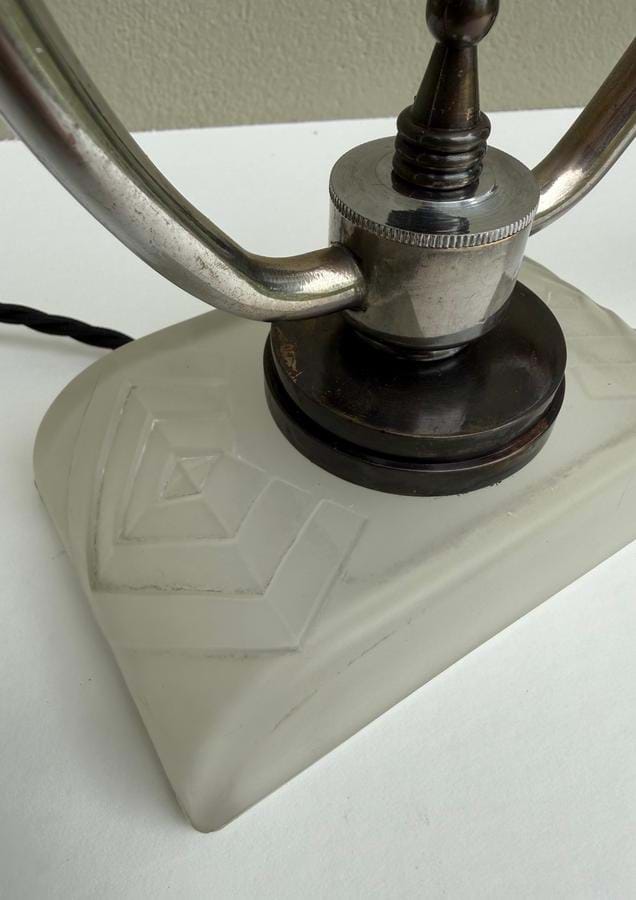 Lamps have frosted glass bases with stepped solid bronze tops below the hoops.