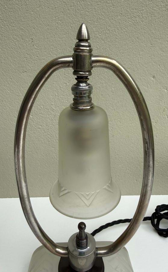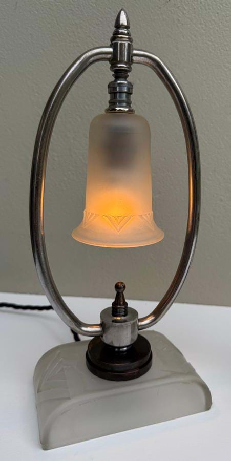 A great pair of very well designed and made 1930's American Deco nickel plated brass 'hoop' lamps with their original frosted glass shades.