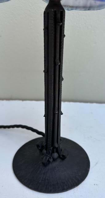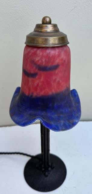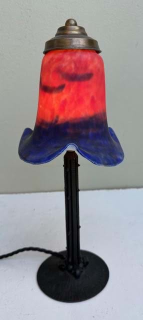 A 1930's French Deco black wrought iron lamp with original red/blue glass shade.