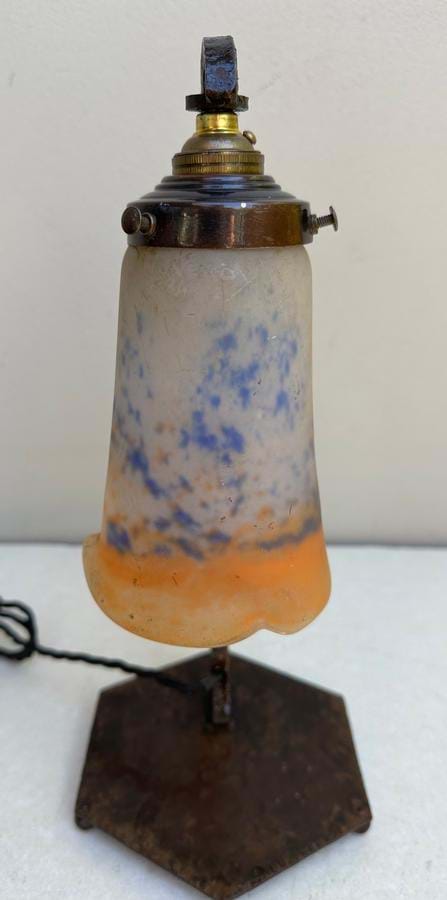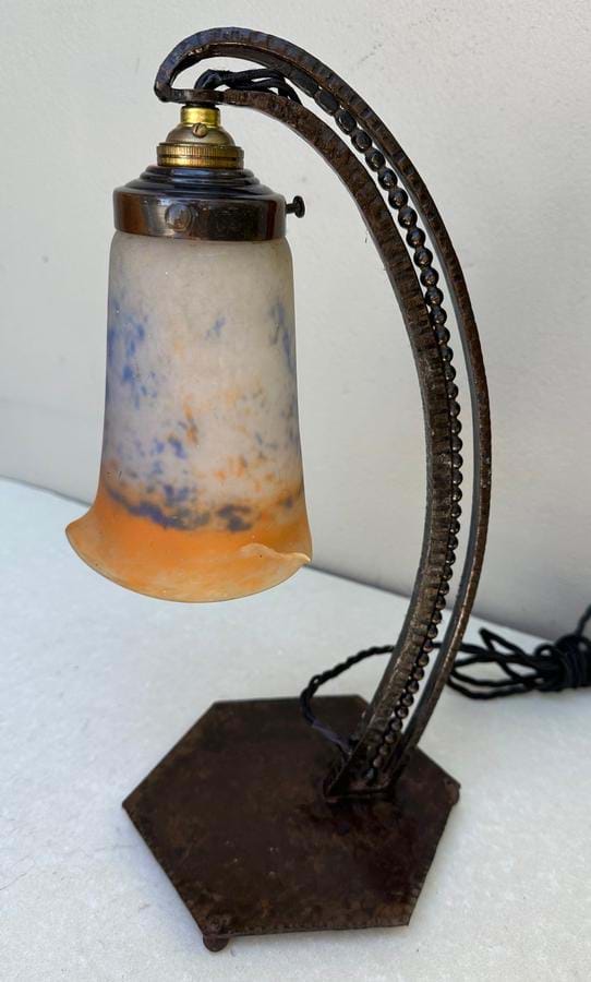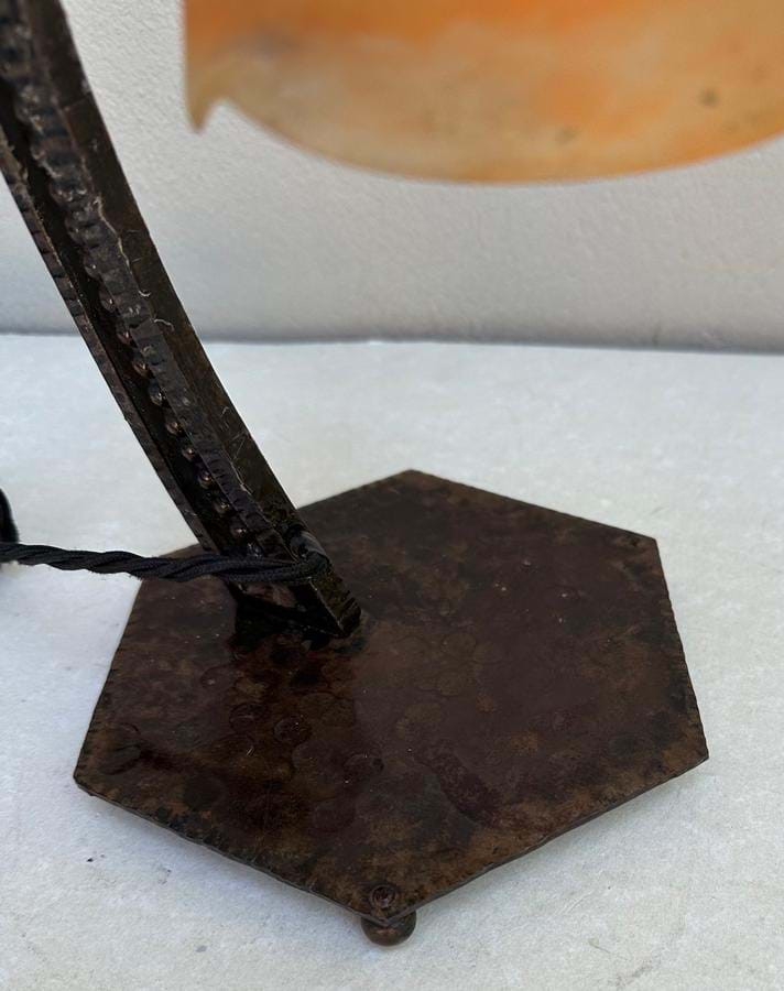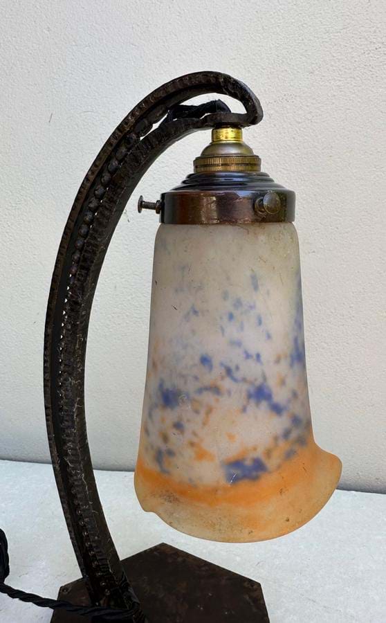 A hand forged tall 1930's French Deco curved iron lamp with original (signed) Noverdy orange/blue/white glass shade.