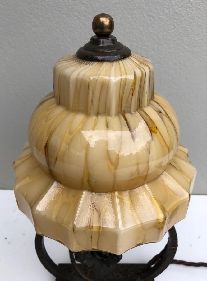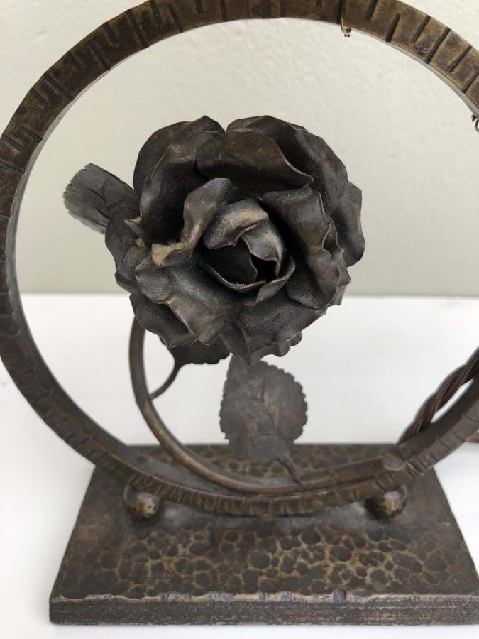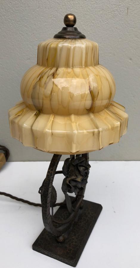 A very nice 1930's French Deco iron 'ring' lamp with rose flower decoration and original moulded yellow/brown glass shade.