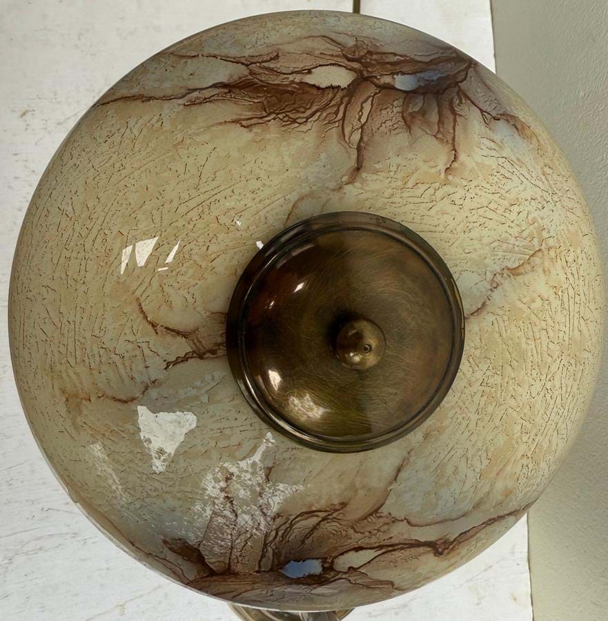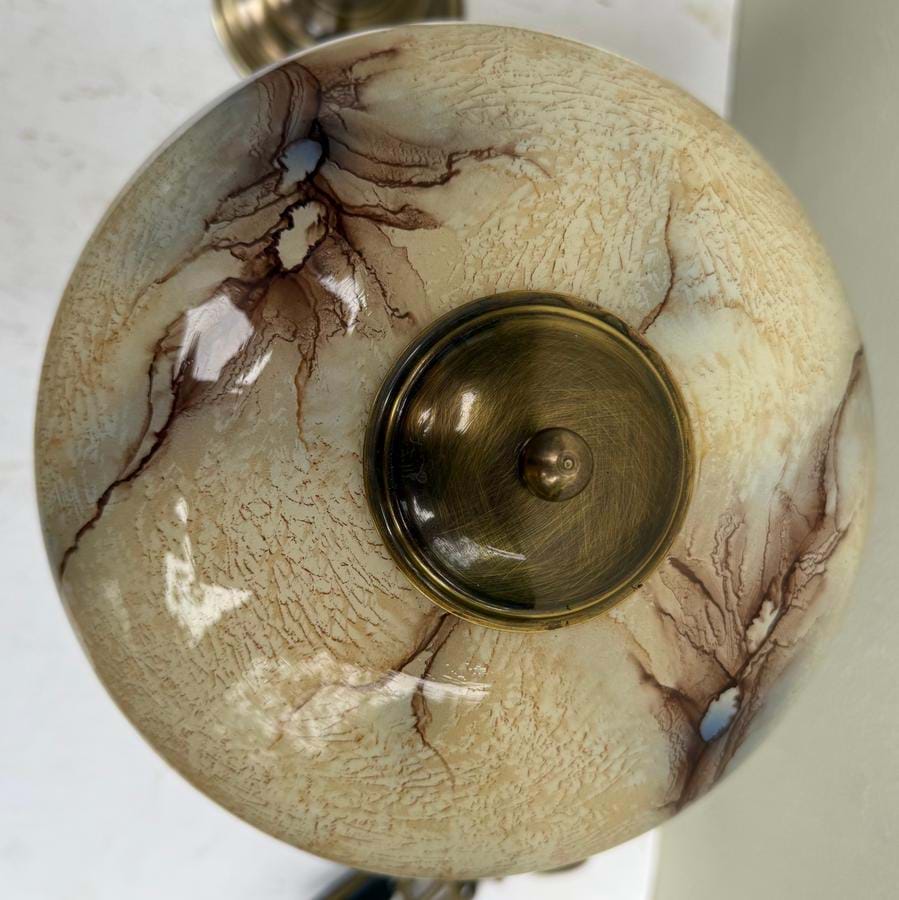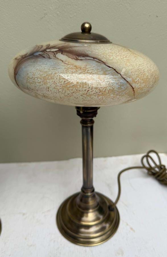 A nice pair of solid brass column lamps with aged patina finish and original 1930's German Deco cream glass shades with brown/touch of blue veining.