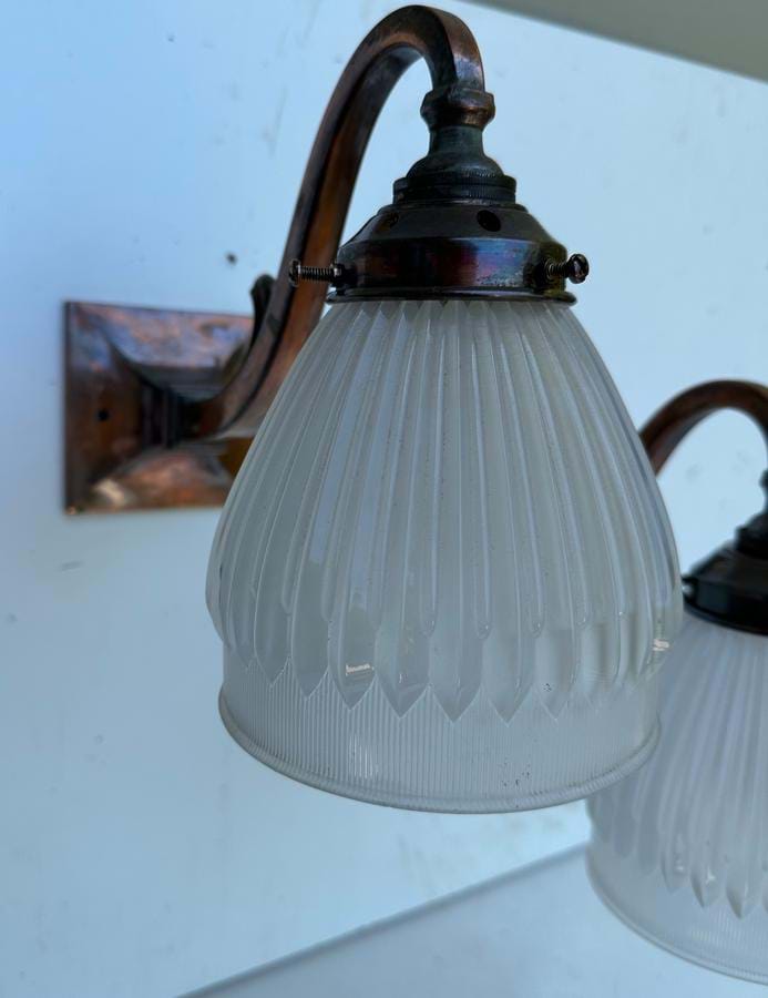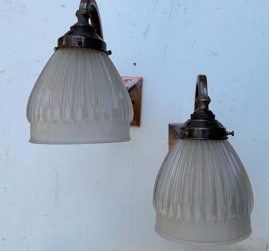 A very nice solid brass 1920's/30's English Deco/Arts& Crafts wall light with its original (not reproduction!) 'Holophane' glass shade.