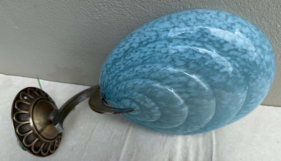 An exceptional pair of 1930's French Deco/Modernist brass/chrome wall lights with their original moulded blue mottled glass shades.