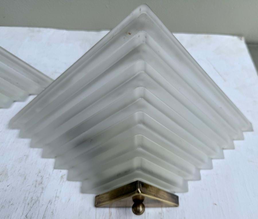 A very nicely made large 1970's European (Spanish) Deco brass wall lights with heavy stepped clear/frosted glass shades.