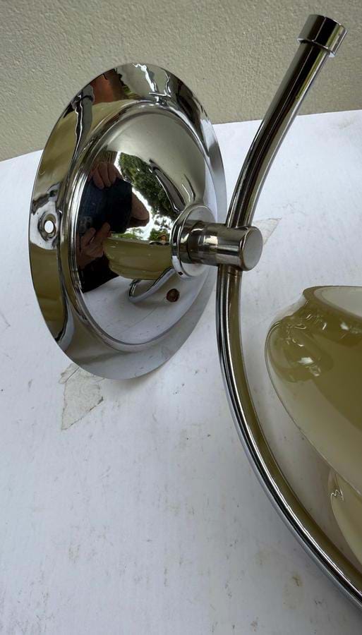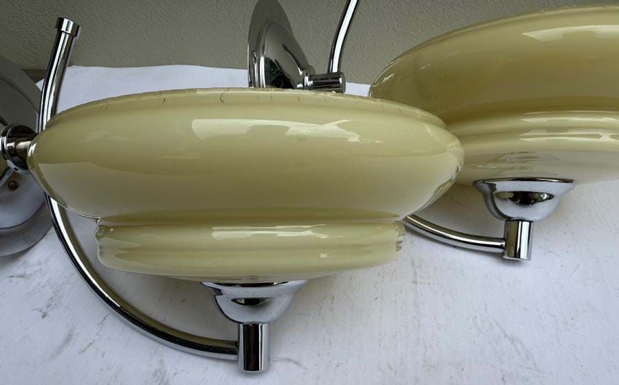 A nice pair of 1930's Deco chromed brass wall lights with curved arms and original moulded cream cased glass shades.