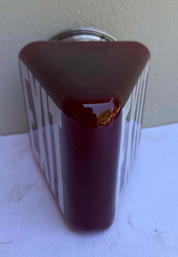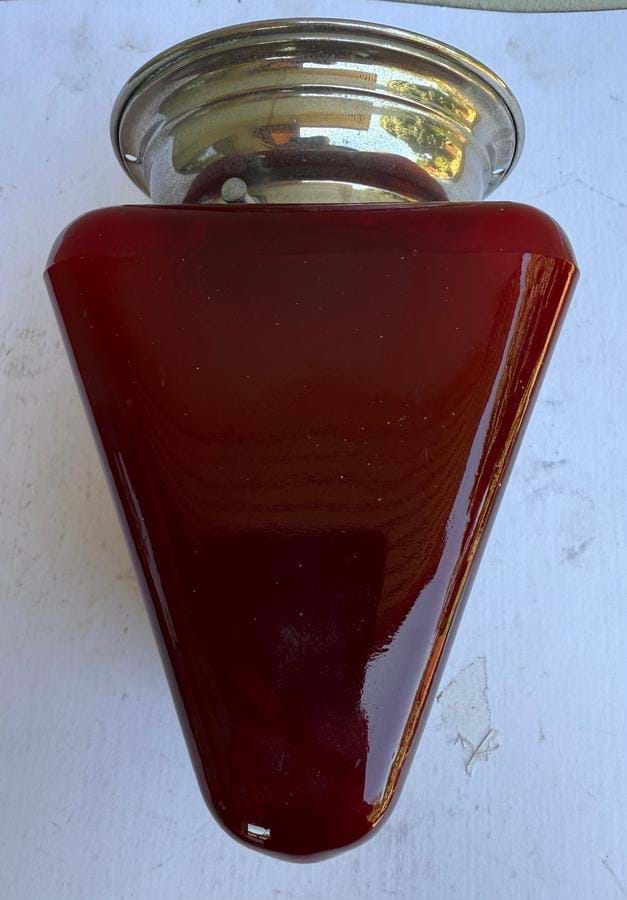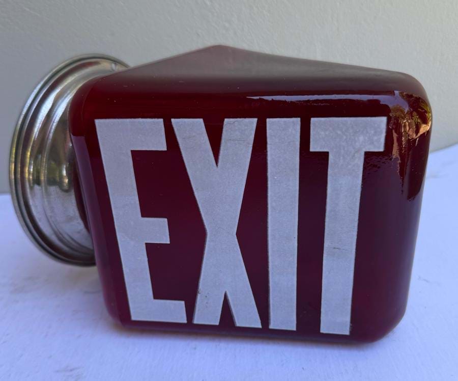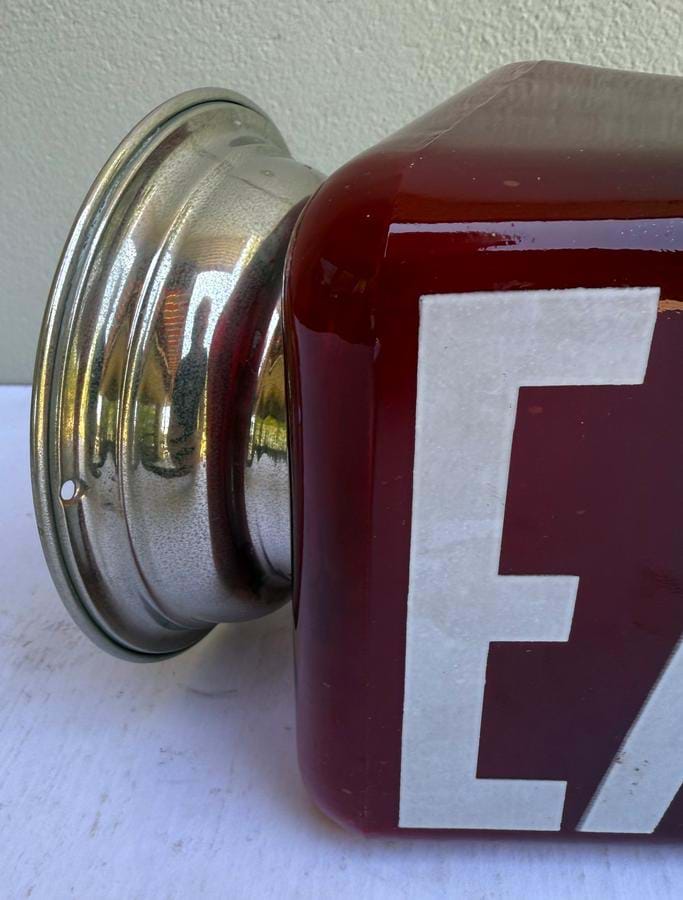 A great 1930's American Deco ruby triangular glass exit wall light with white lettering on both sides.