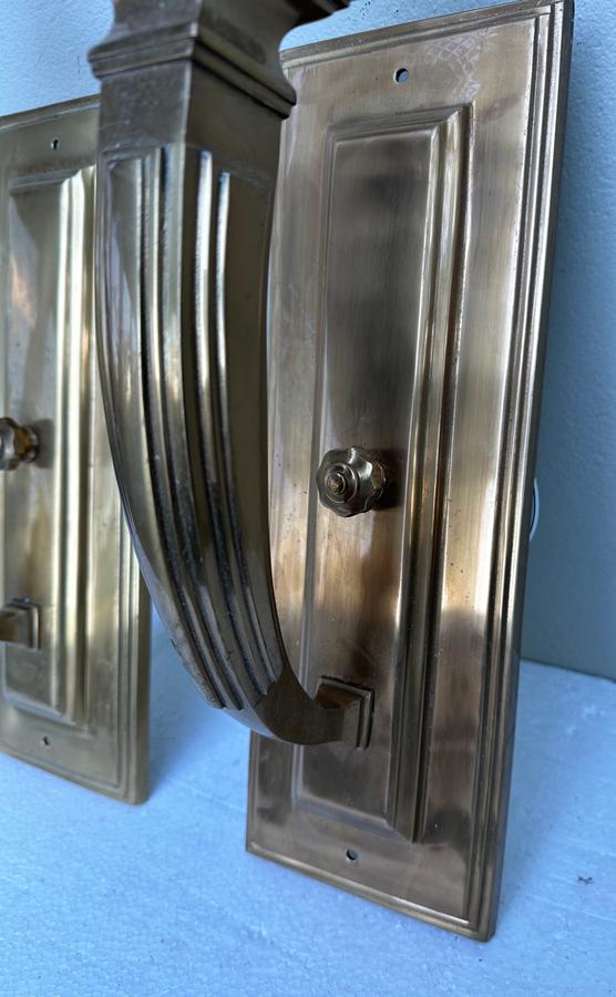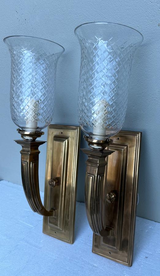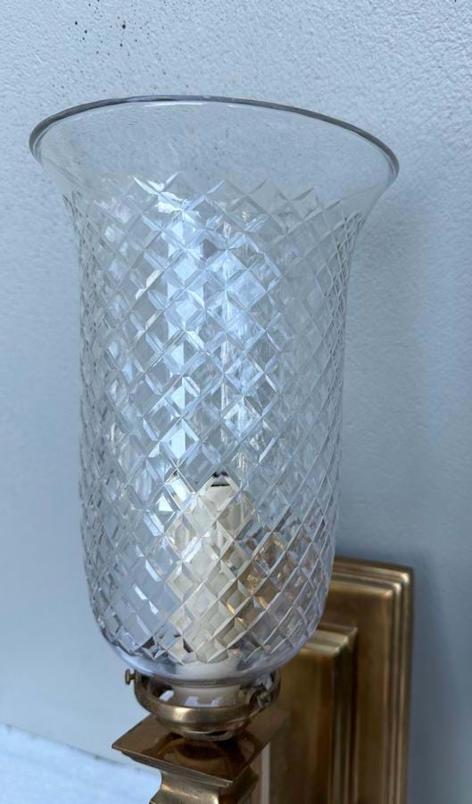 Impressive pair of large Italian brass wall lights with diamond pattern glass bell shades.
