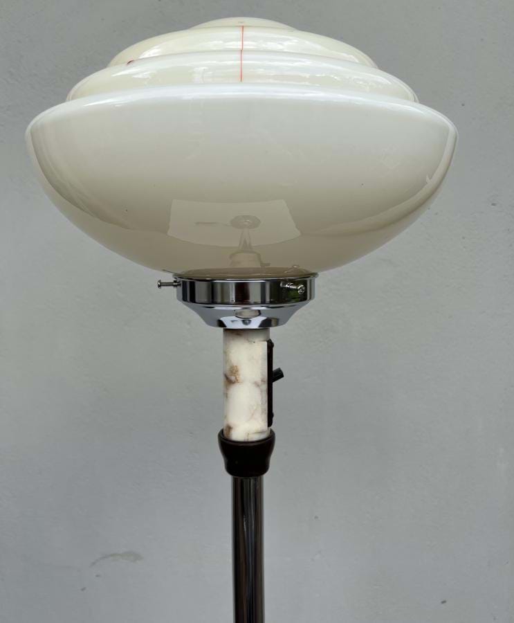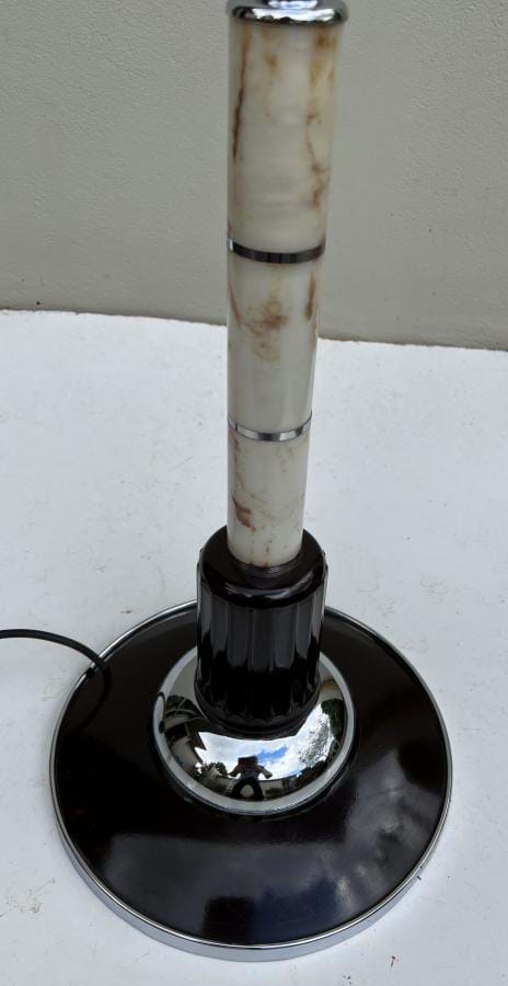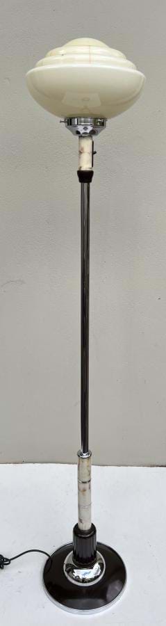 A very attractive 1930's chrome and bakelite column floor lamp with original cream stepped/hand decorated glass shade.