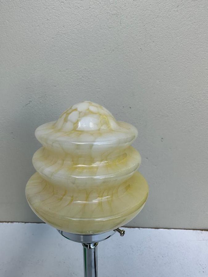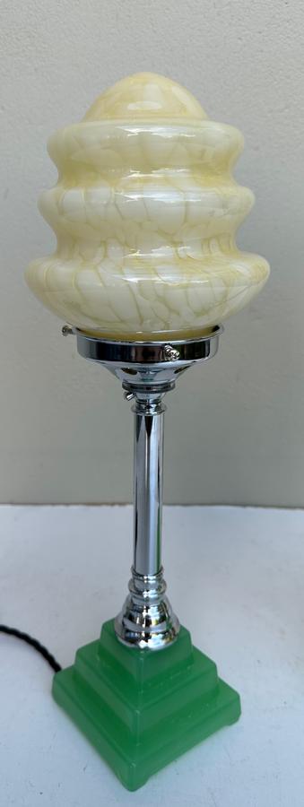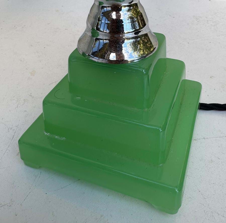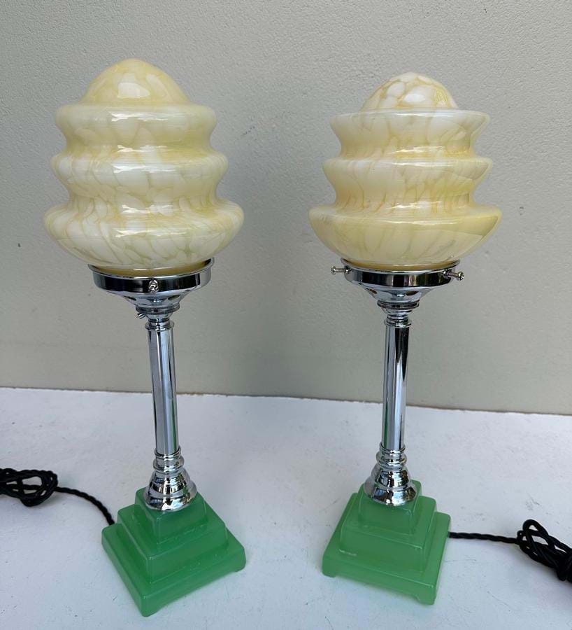 A great pair of 1930's American Deco stepped green glass base/chrome column lamps with original cream stepped glass shades.