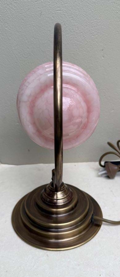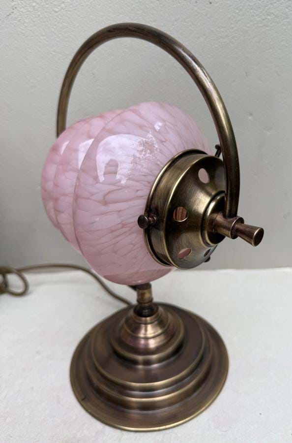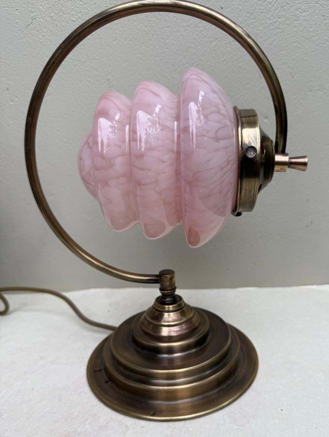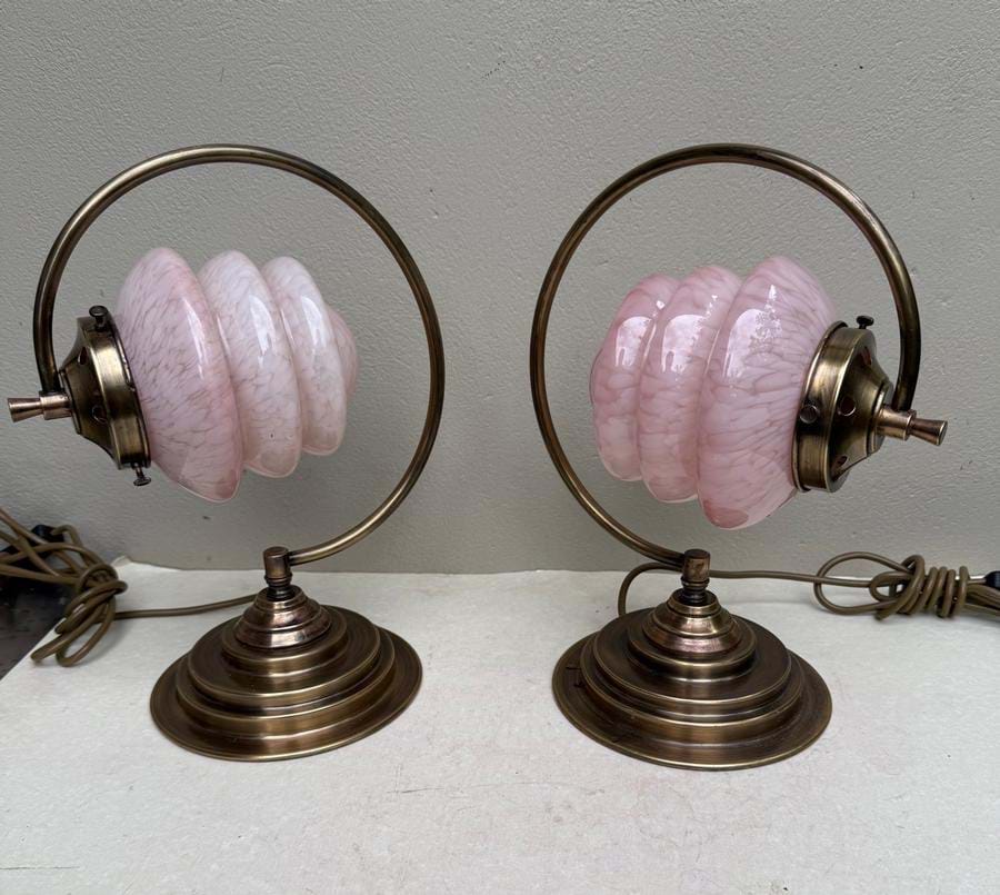 A unusual pair of 1930's English Deco brass 'ring' lamps with stepped bases and original pink stepped glass shades.