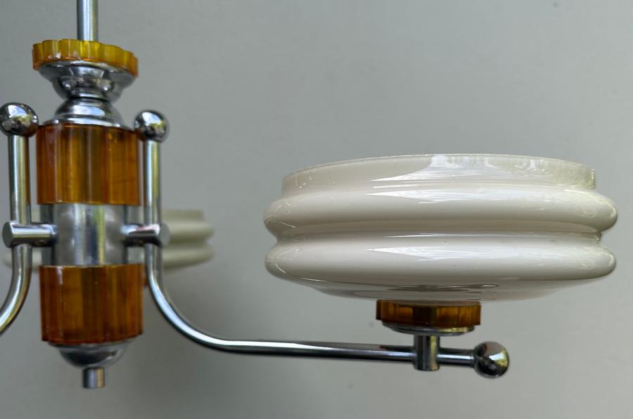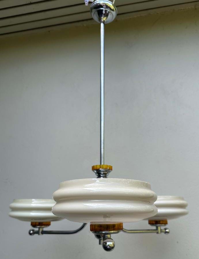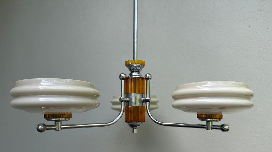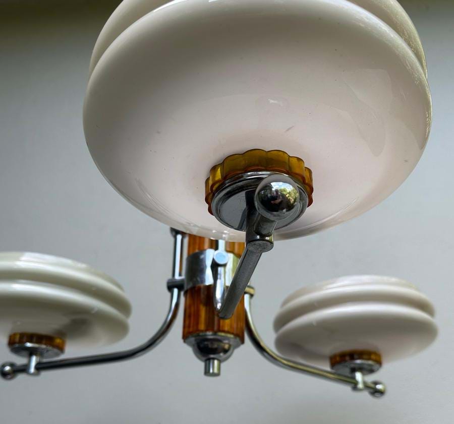 A fine 1930's/40's Deco chromed brass and butterscotch bakelite(?) 3 light chandelier made by Franklite (Melbourne).