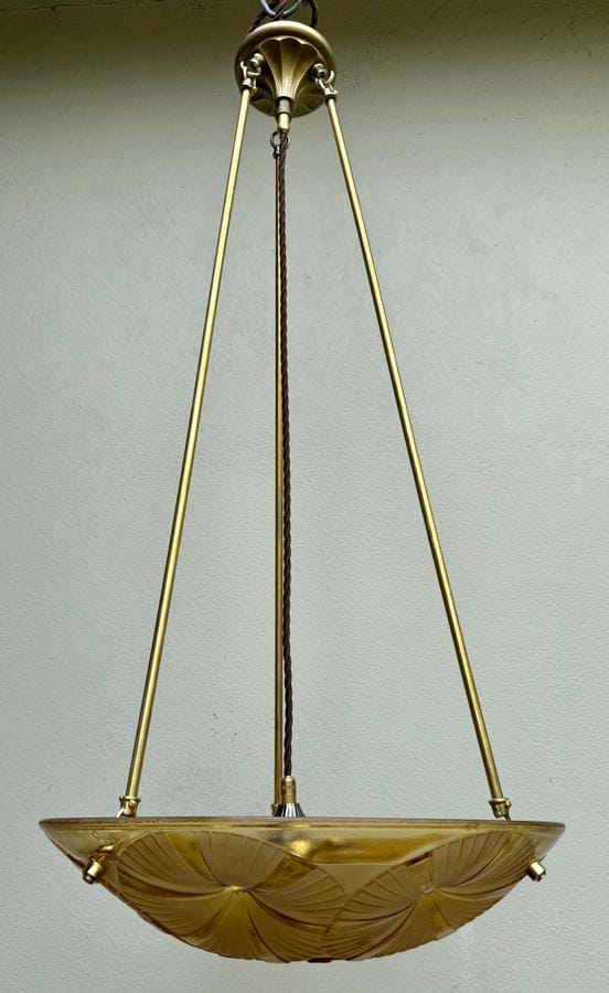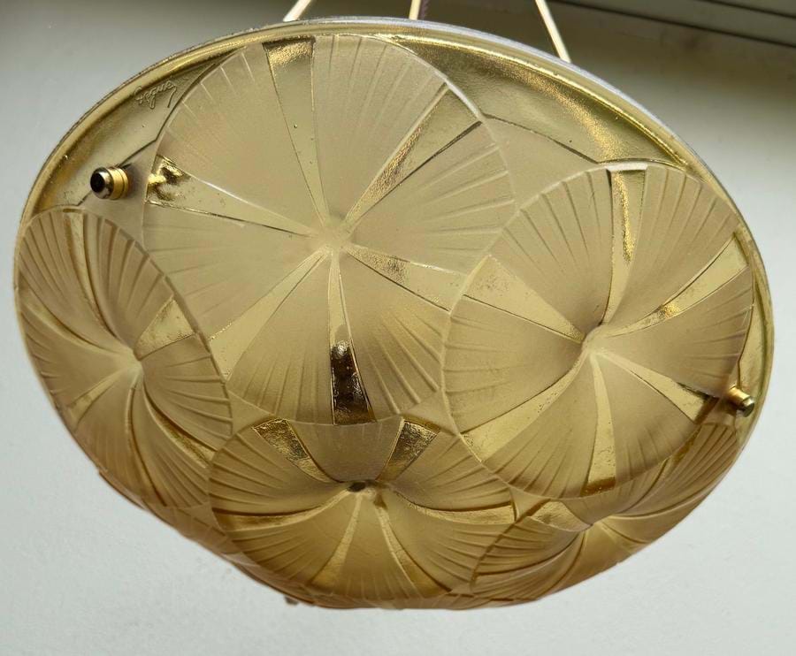 A fine large 1930's French Deco moulded amber glass ceiling light shade made by Degue (signed).