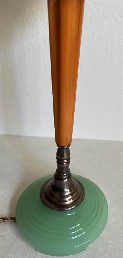 An attractive 1930's American Deco brass and bakelite/catalin column lamp with green glass base.