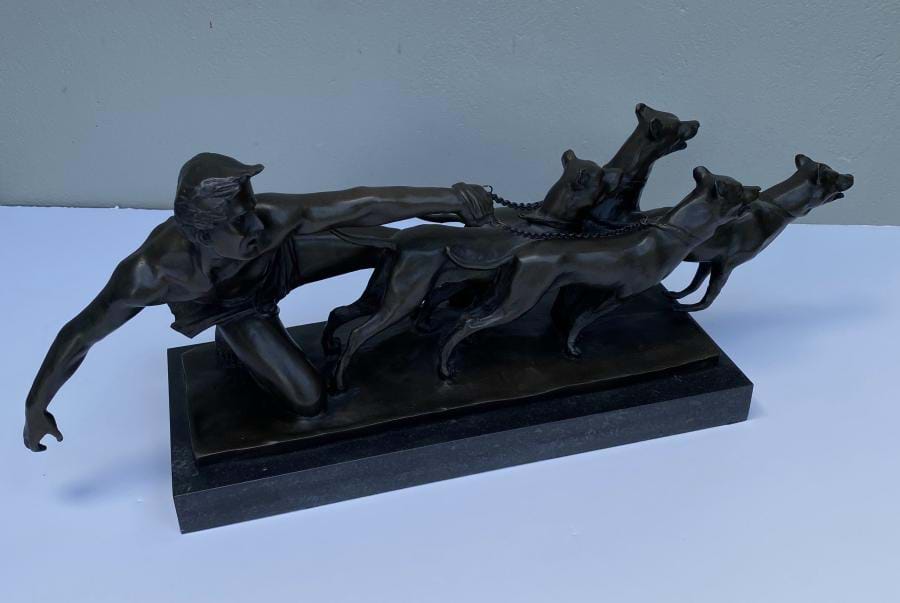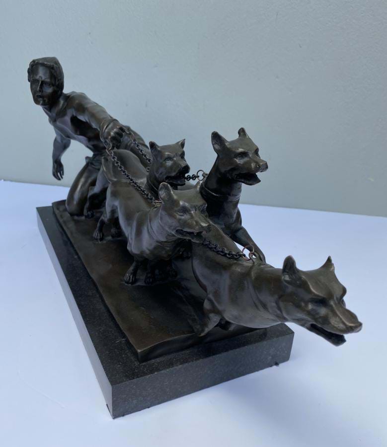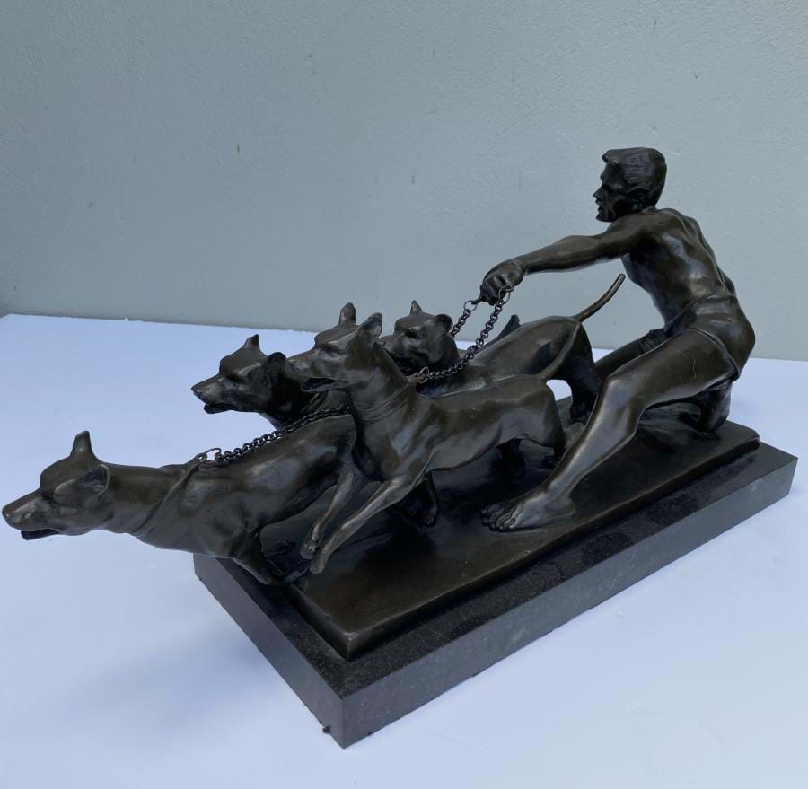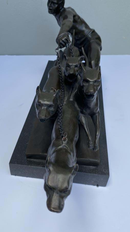Large French deco bronze patinated sculpture of a man trying to control a group of fierce dogs! Mounted on a black marble base and in excellent condition. A substantial...and weighty...sculpture! Measures 620mm long by 250mm high, and the base is 410mm long by 170mm deep.