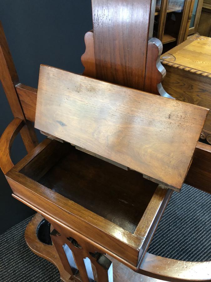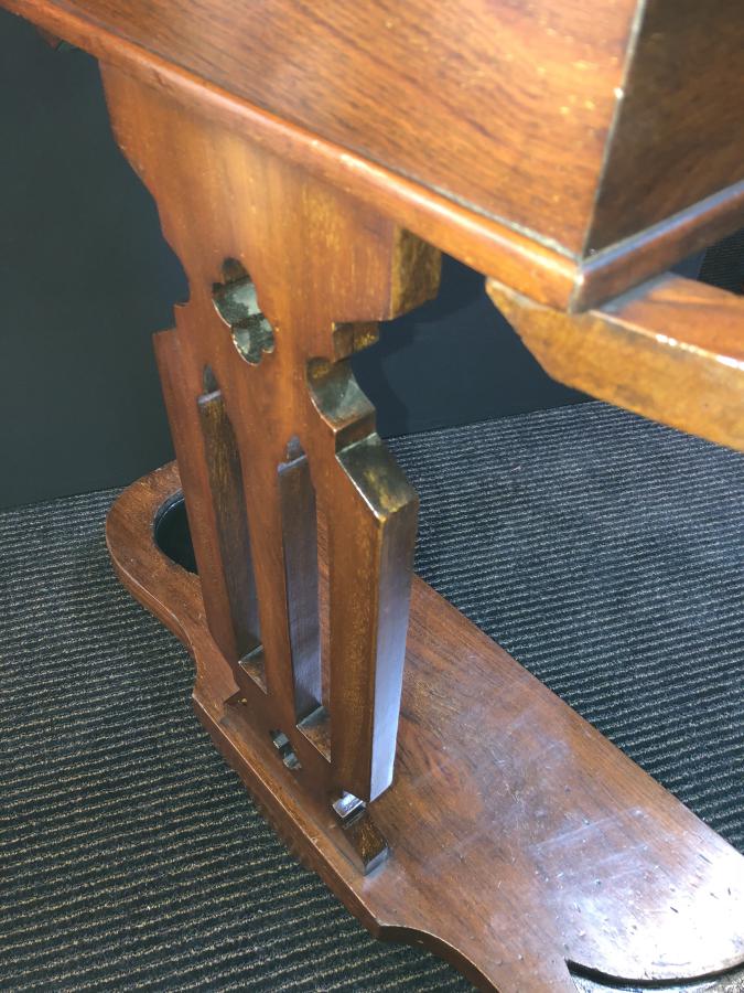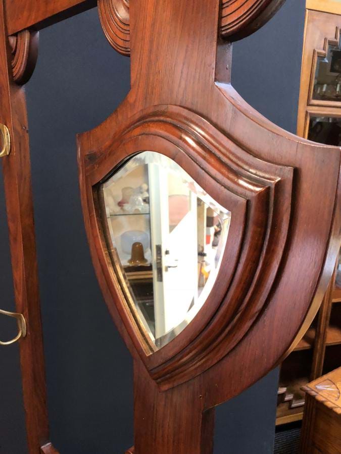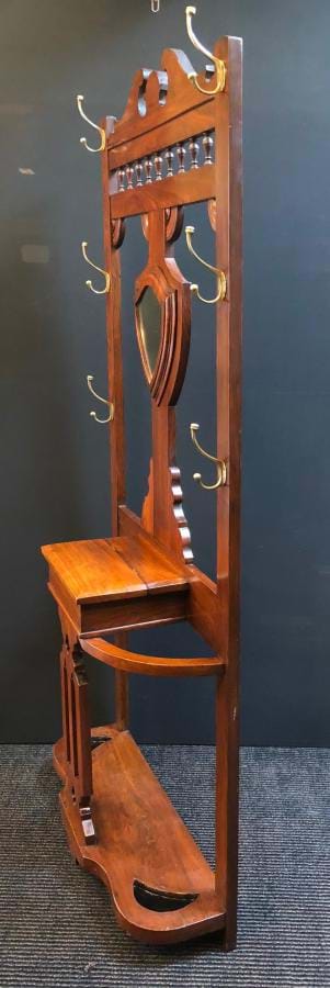 Fine late Victorian English walnut hall stand with central bevilled edge shield mirror and brass hooks. Stand also has a useful central drawer with hinged lid and umbrella/walking stick stands on either side. Presented in excellent detailed condition. Measures 2050mm tall by 920mm wide and extends out 300mm
