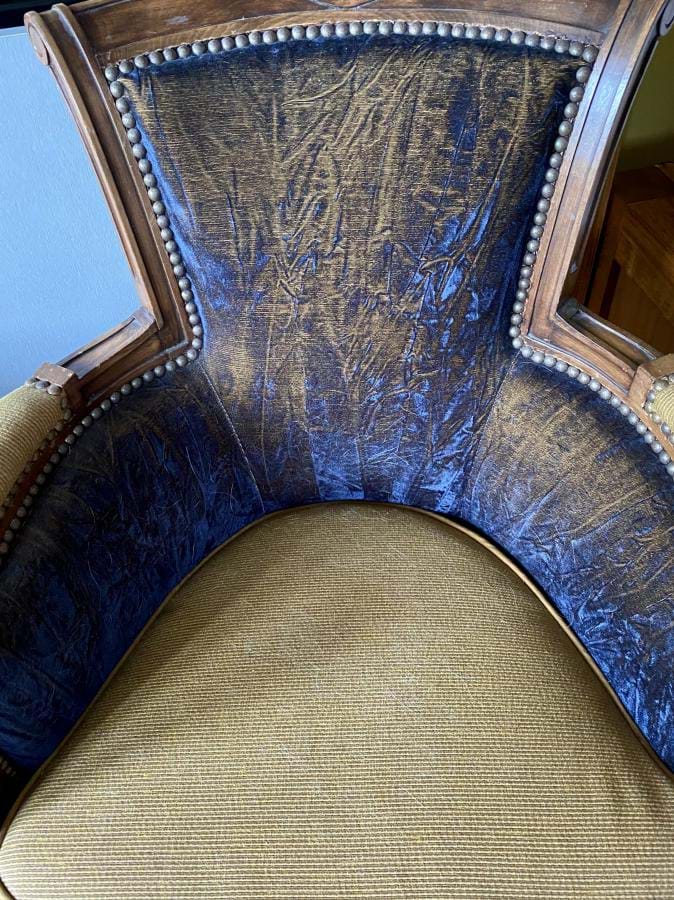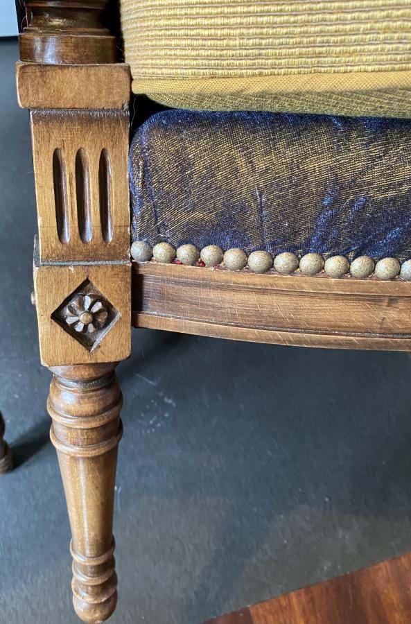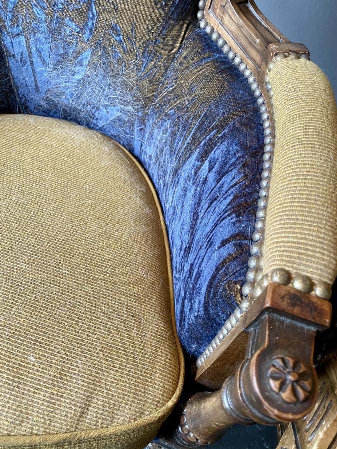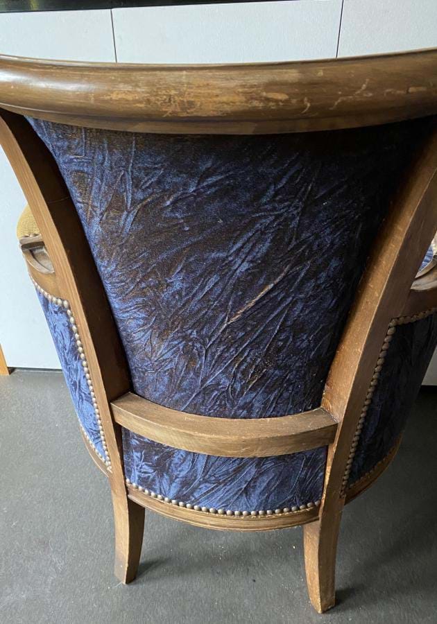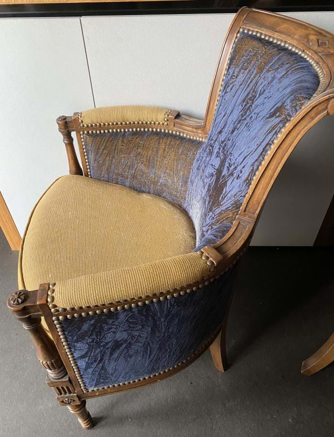 Lovely pair of 1930's/40's French carved walnut bergeres with luxurious (newly upholstered) rich blue/gold fabric These chairs are very comfortable !....and in excellent condition. Each is 780mm high (back).....460mm to seat/cushion, by 640mm wide. Price shown is for the pair.