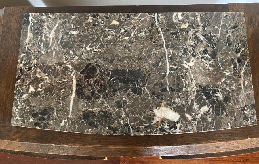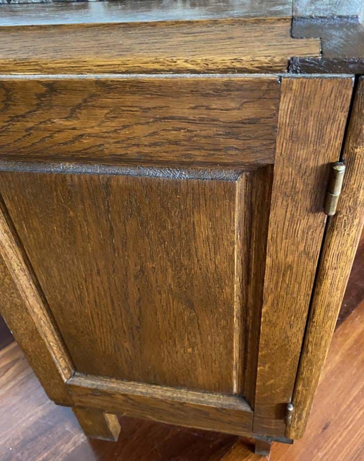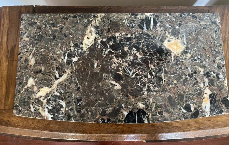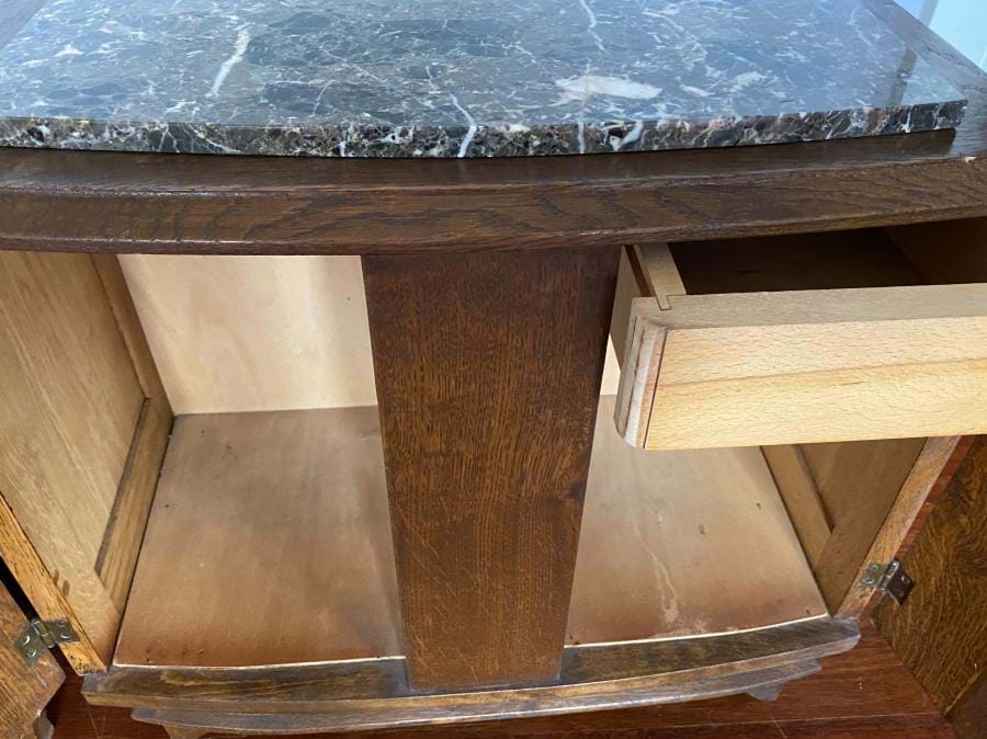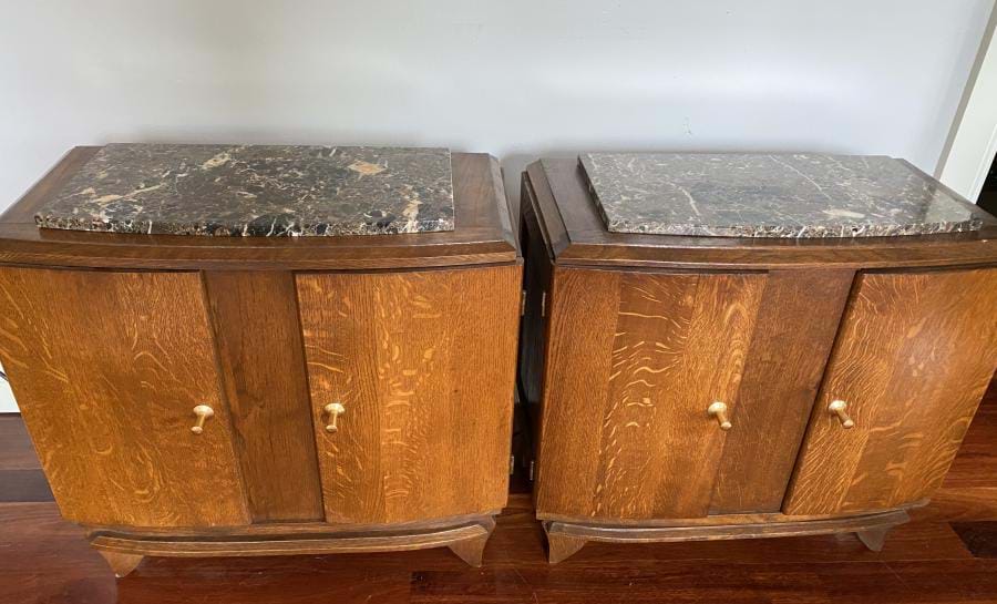 Very stylish pair of 1930's French deco solid oak bedside cabinets with attractive black/whte marble tops. Cabinets are very well made and have internal storage space along with a dovetailed drawer in each. Have their original brass pull handles and are presented in excellent condition overall. Each is 620mm wide by 580mm high and are 330mm deep. Price shown is for the pair.