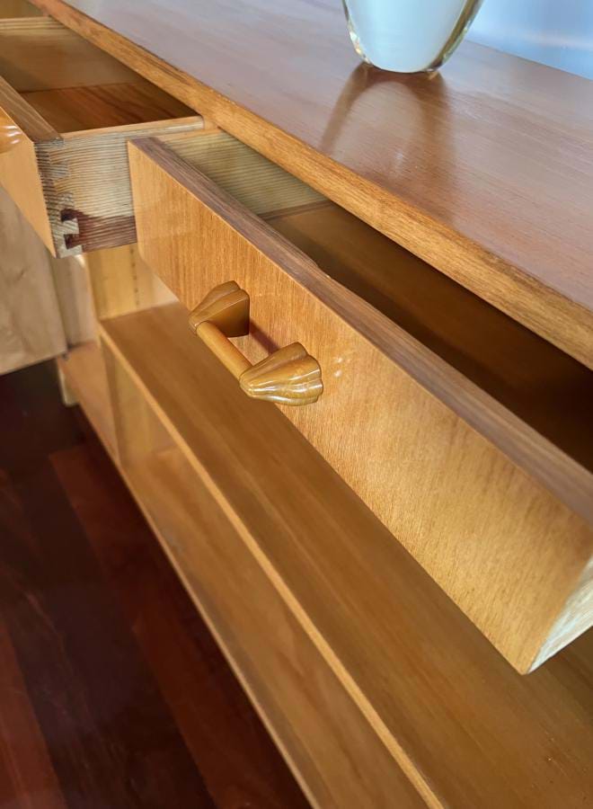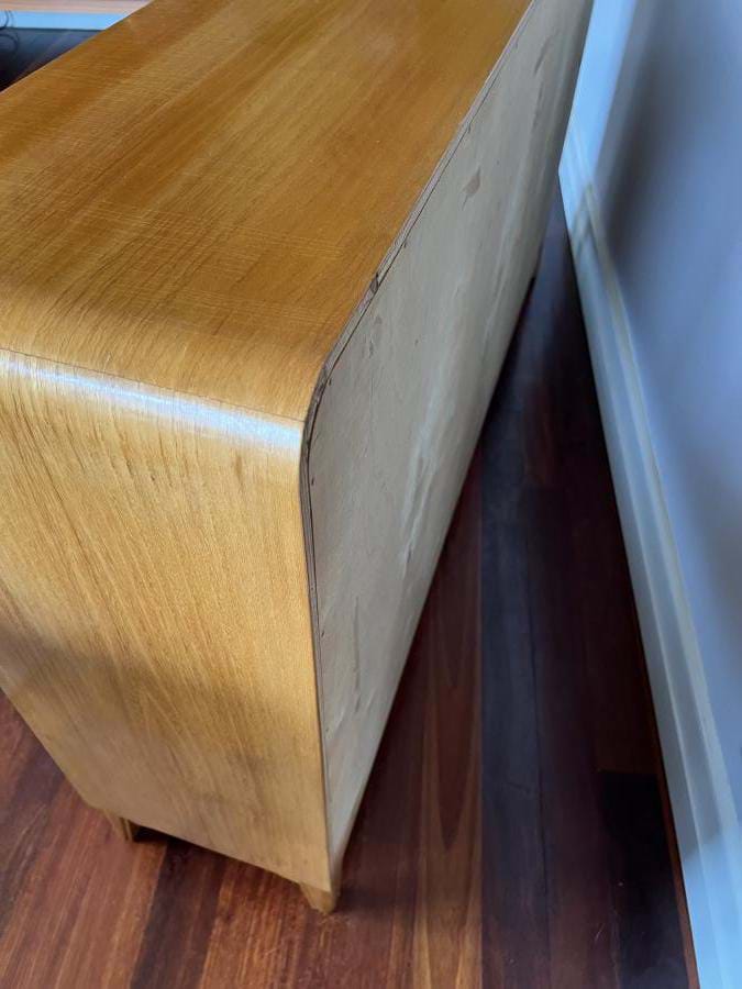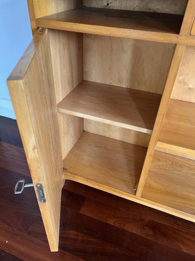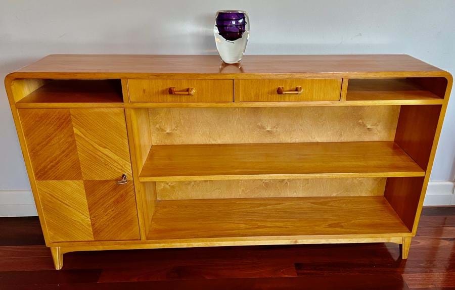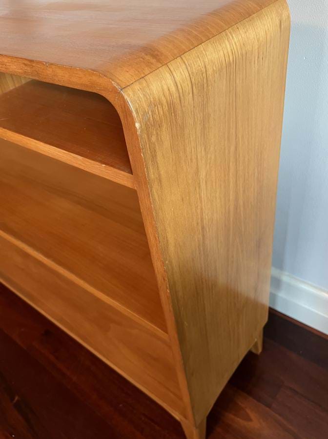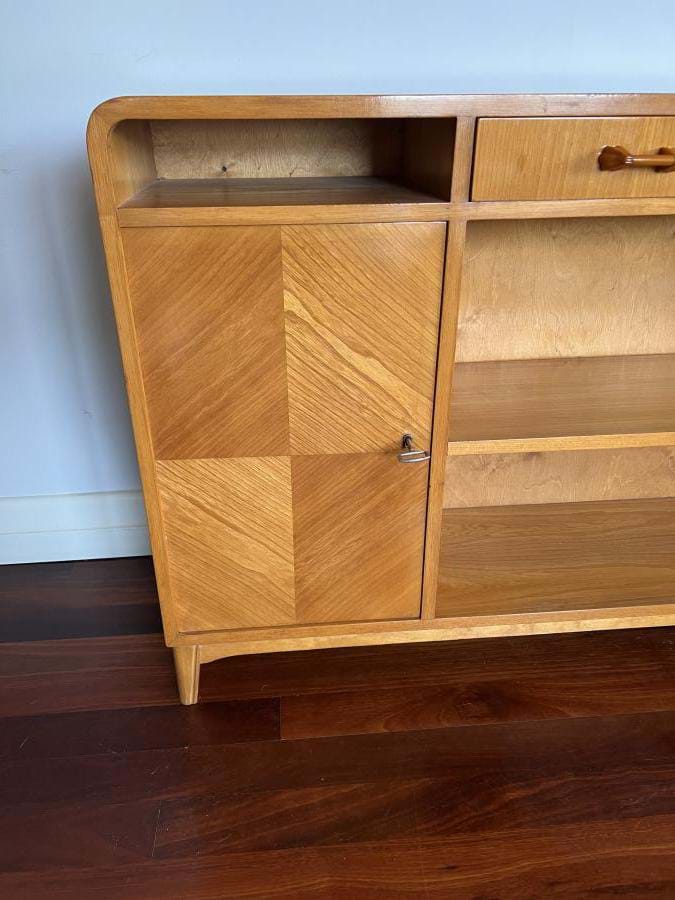A most attractive 1940's/50's Scandinavian Deco bookcase with adjustable shelf, two drawers (both with bakelite handles) and a single cupboard with marquetry front....and key!