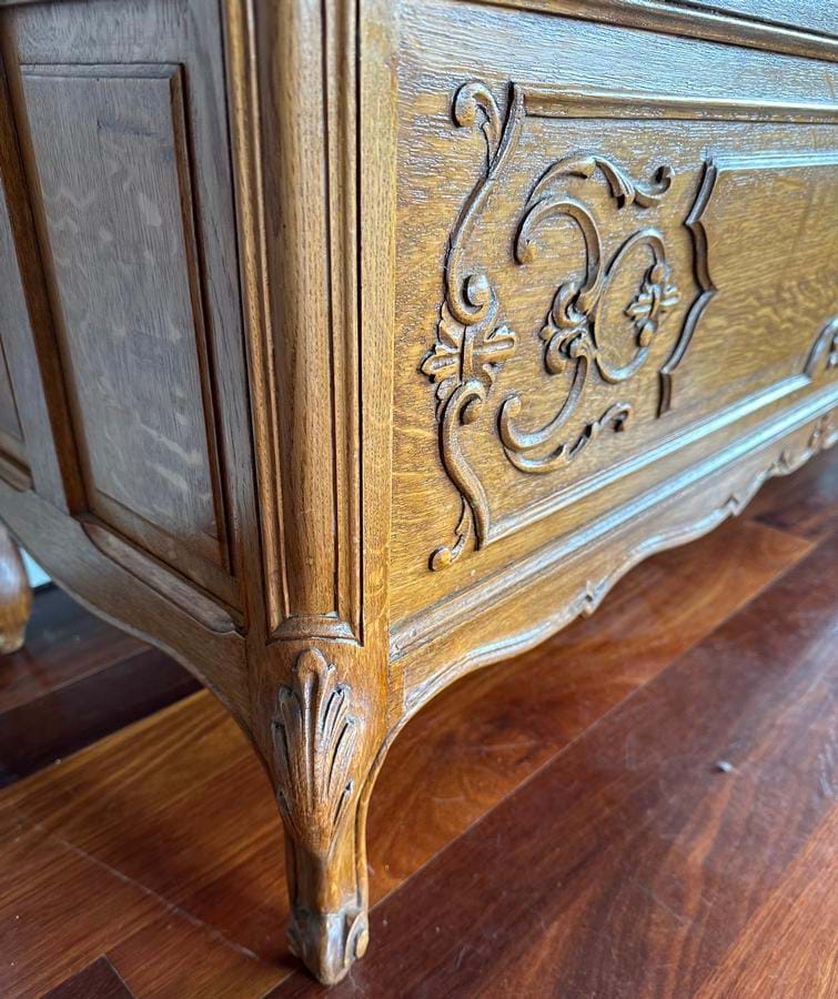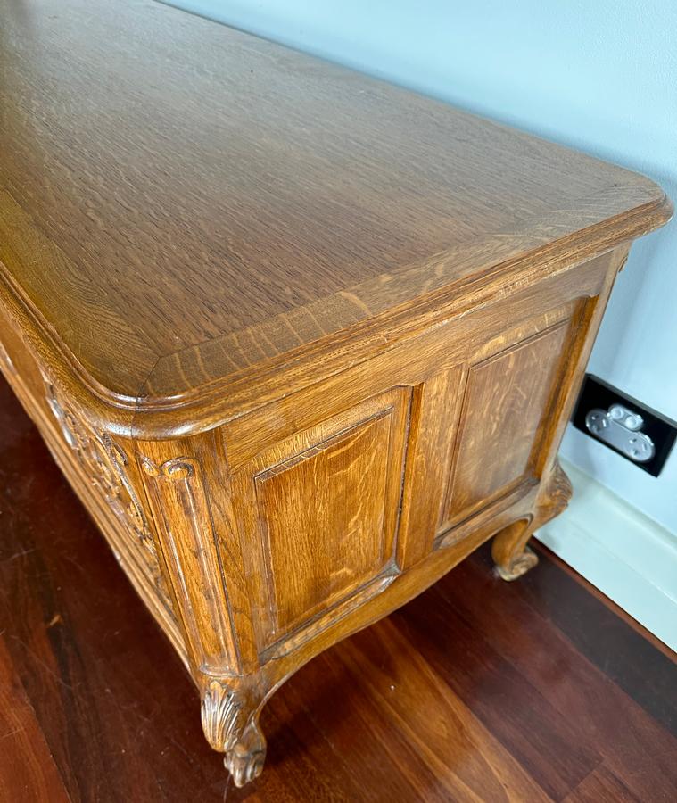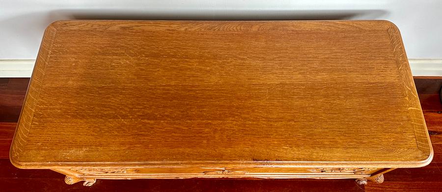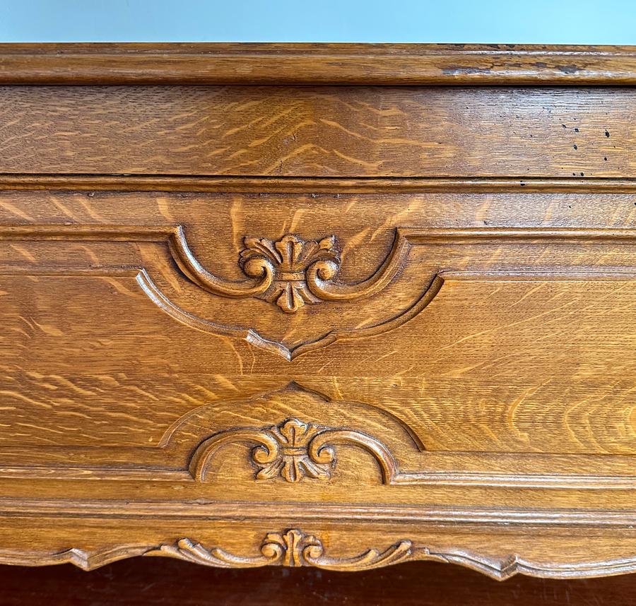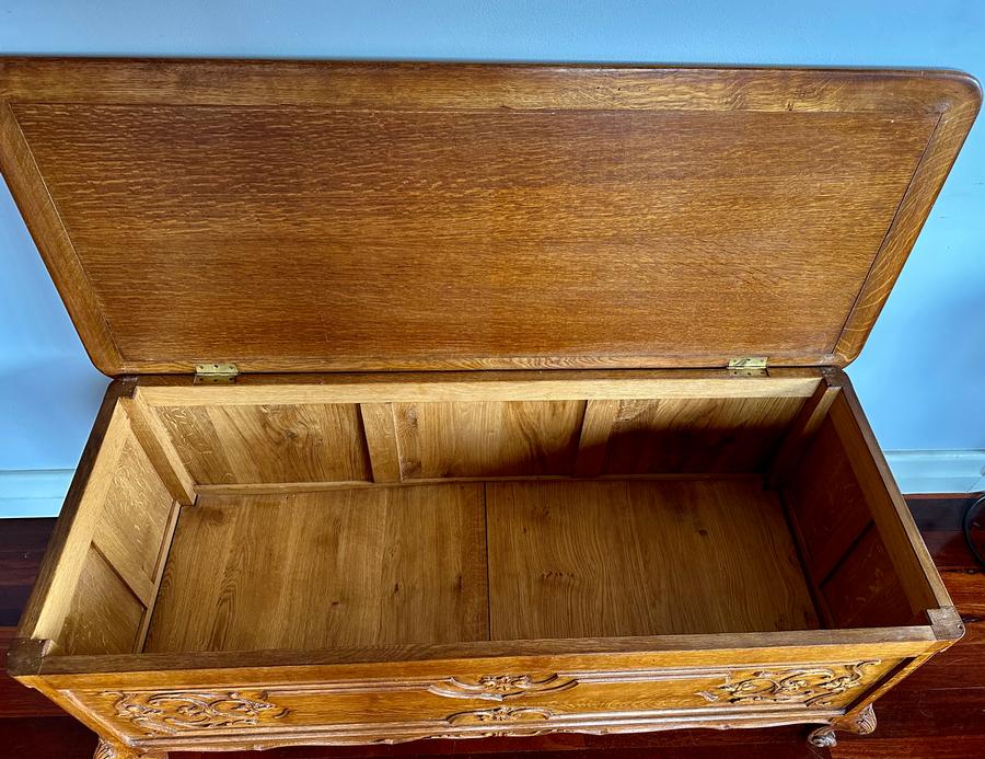 A large 1940's/50's French solid oak storage chest/trunk with carved legs and front and hinged lid.