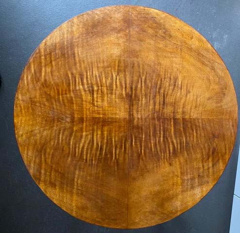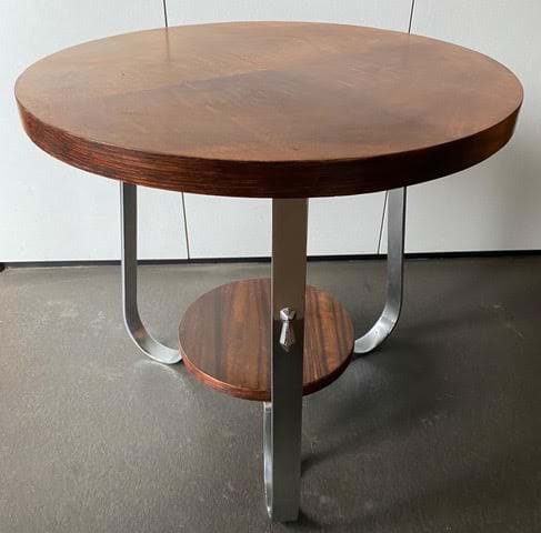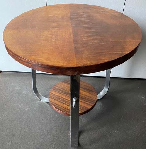 A very nice decorative 1930's Australian Deco side/occasional table with very solid chrome curved legs and a figured Queensland maple top with a Queensland black bean lower shelf!