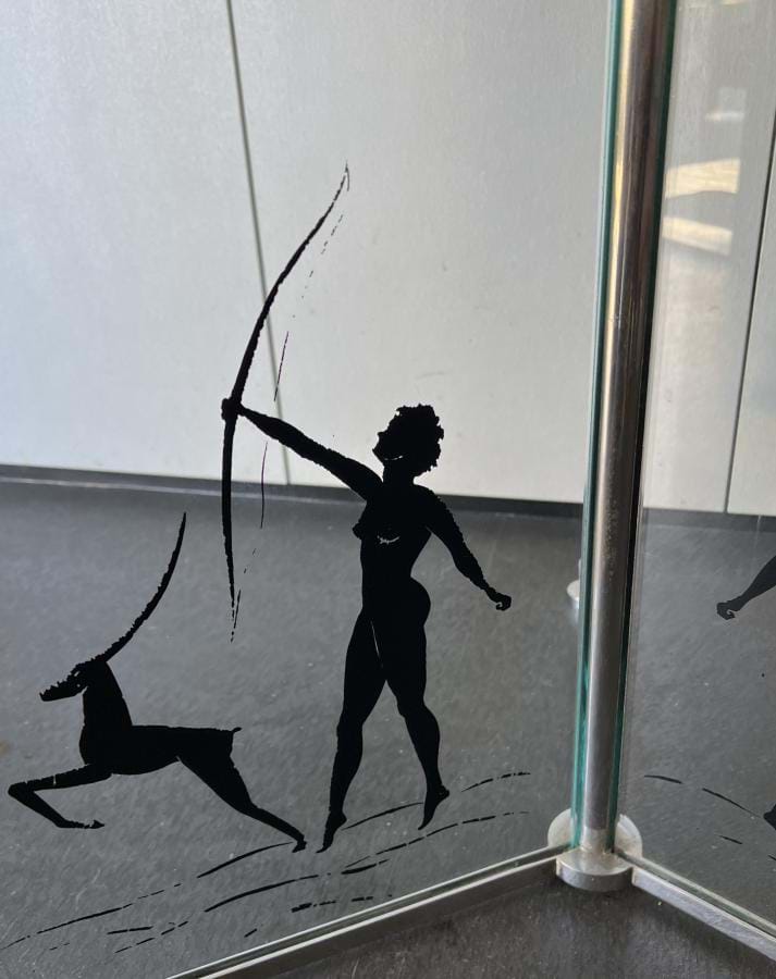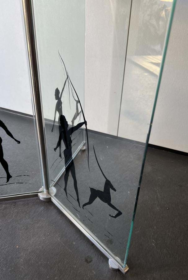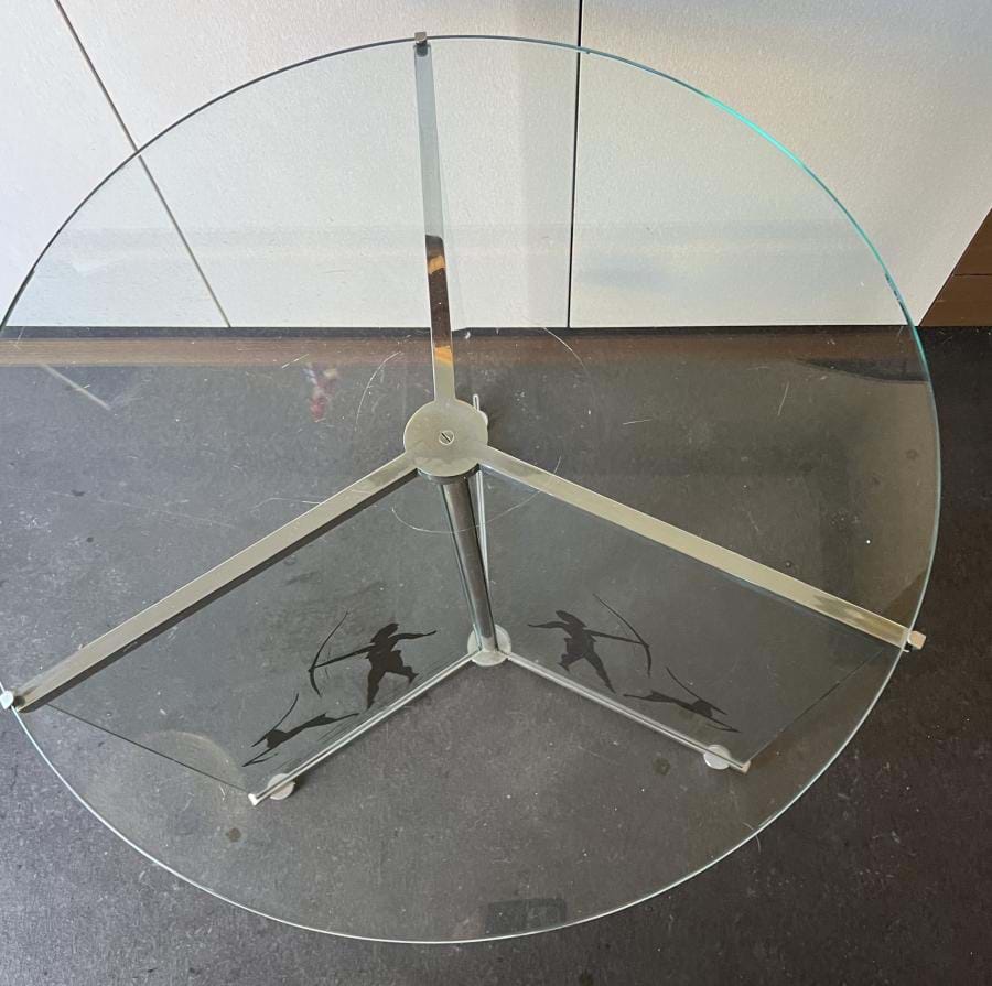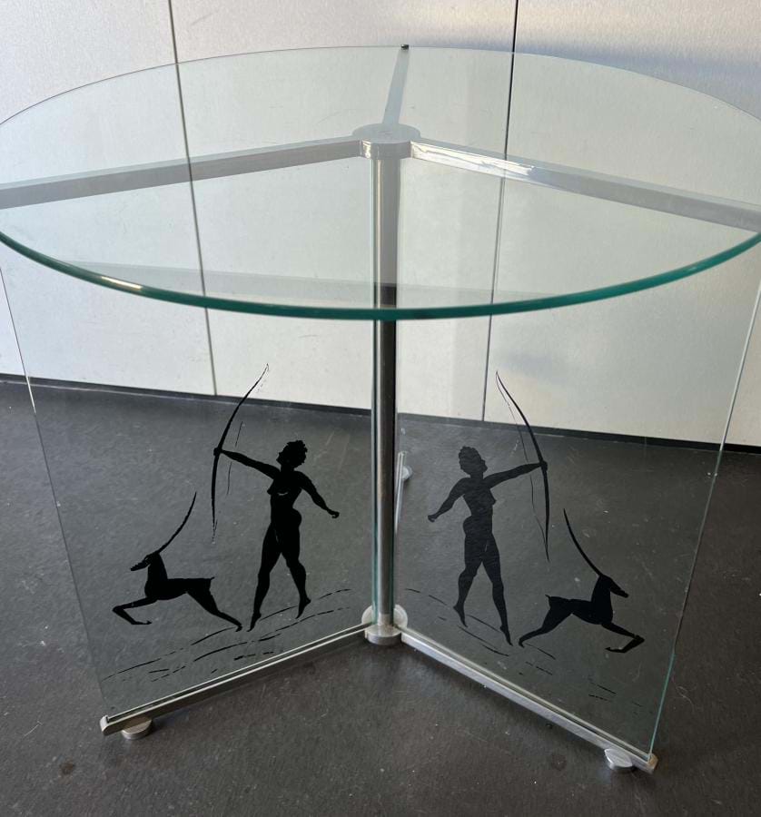 A fine 1930's English Deco glass and chrome 'huntress' occasional table with black fired stencil decoration on each of the three supports/legs.