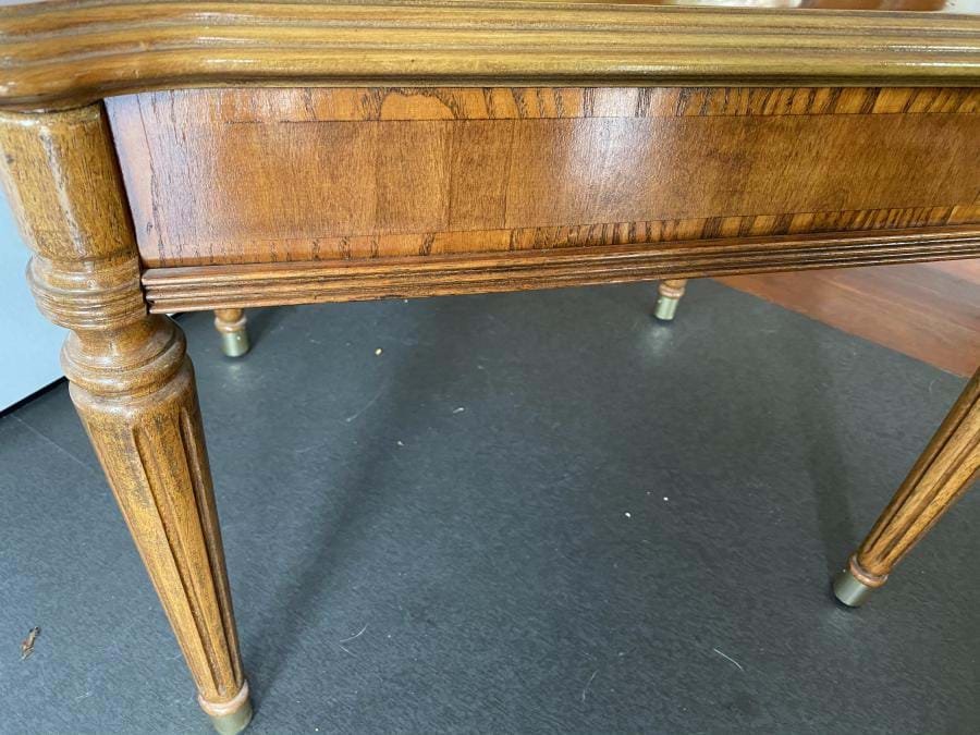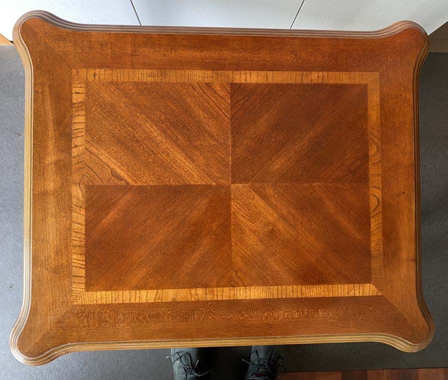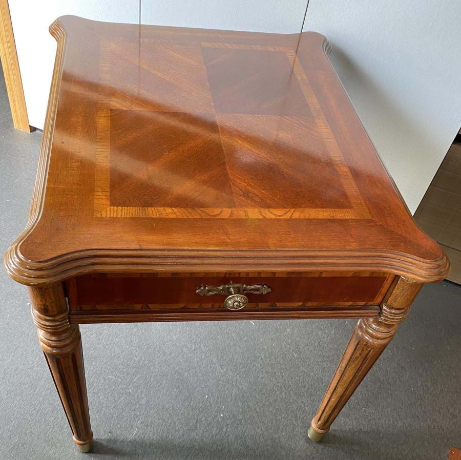 Very nice mid century French...or Italian? oak side table with attractive maple and fruitwood veneered top and sides. Table has a useful single drawer and is in excellent detailed condition. Measures 700mm wide by 570mm deep and is 560mm high.