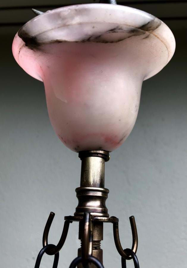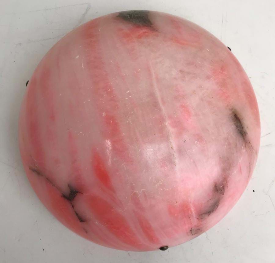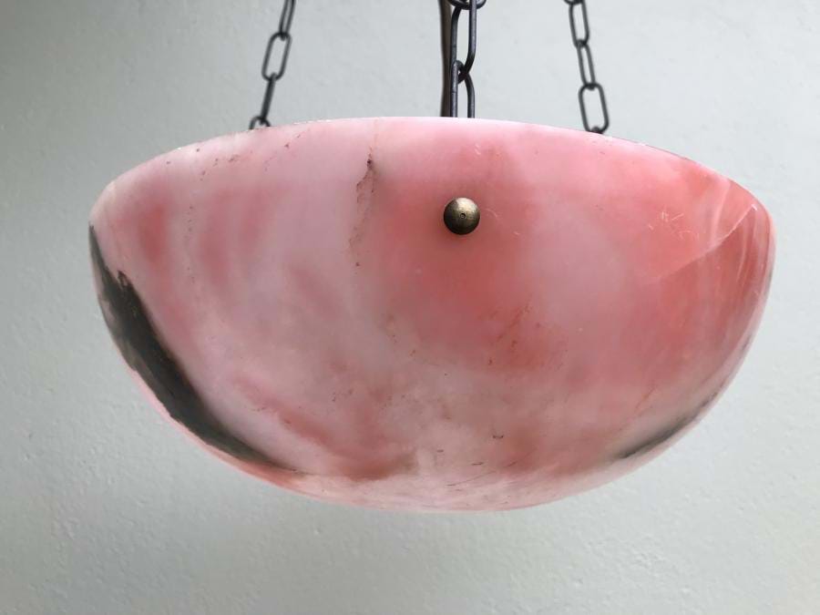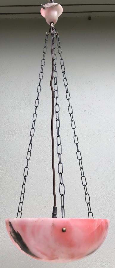 Beautiful 1930's deco pink/black veined alabaster ceiling light shade....complete with its original matching ceiling cap! Comes complete with re-wired 3 chain suspension fittings and is ready to hang. Shade is 300mm wide and the ceiling cap is 90mm across. Overall length/drop (adjustable) is approx. 900mm.