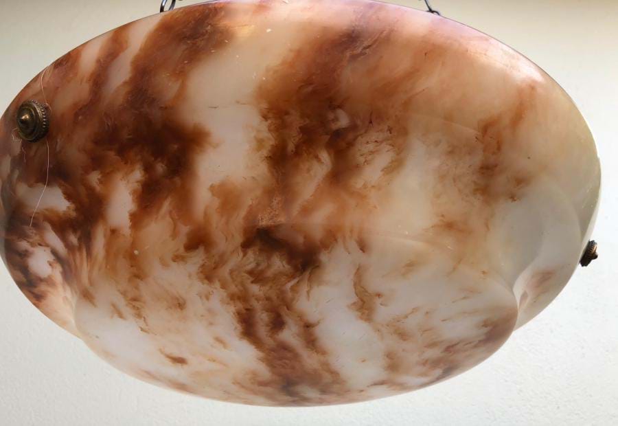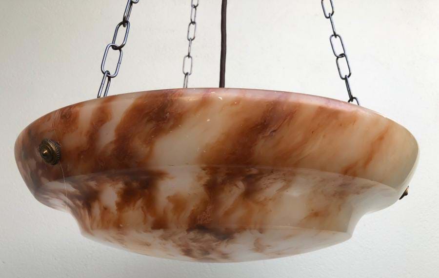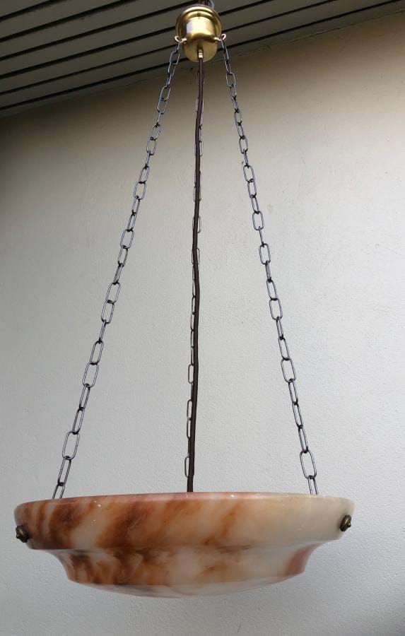 Large 1930's English alabaster ceiling light shade. Great shape and colours. In excellent condition and comes complete with re-wired 3 chain suspension fittings. Takes 2 standard globes. Shade is 400mm wide and the overall length/drop (adjustable) is approx. 800mm.