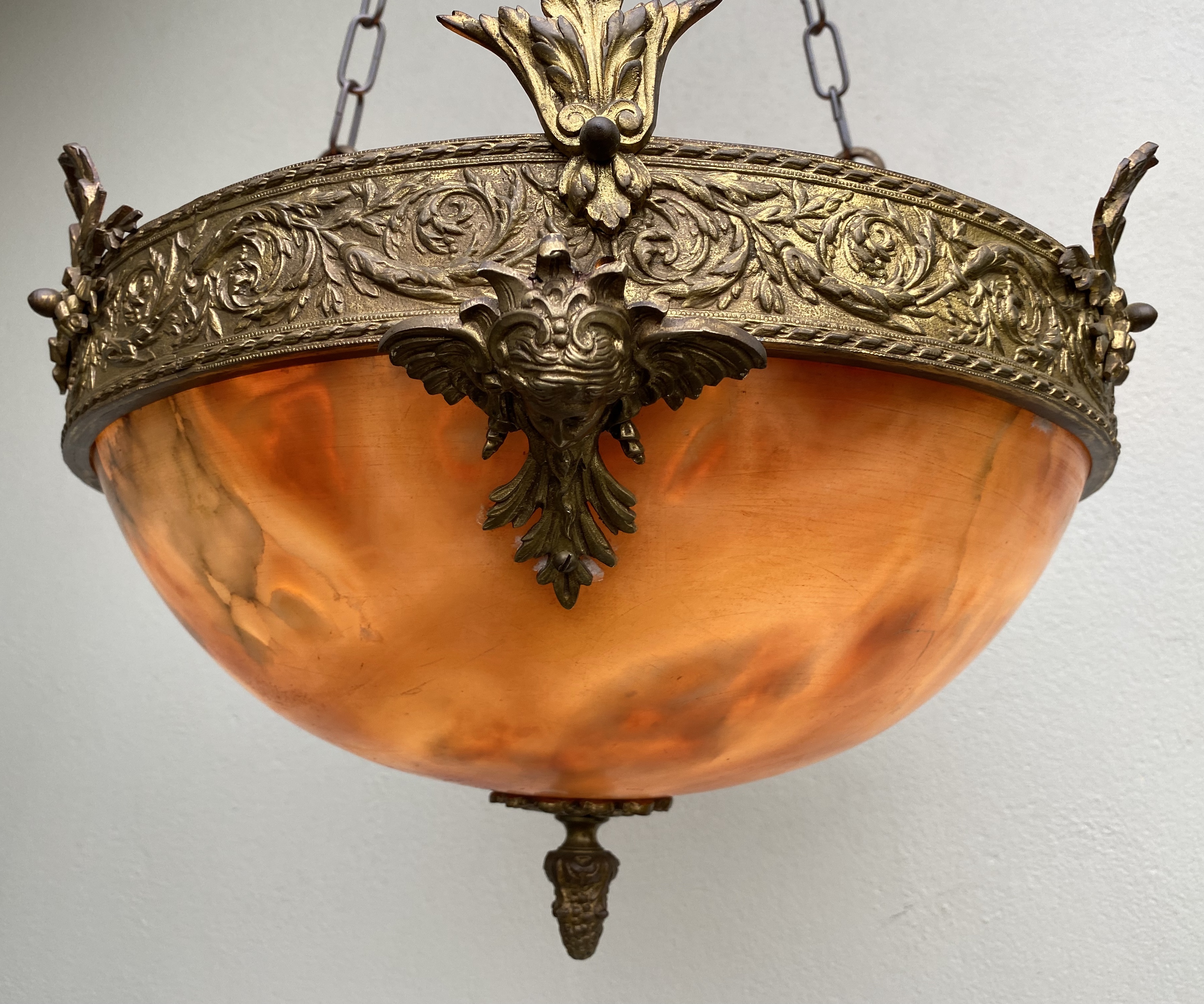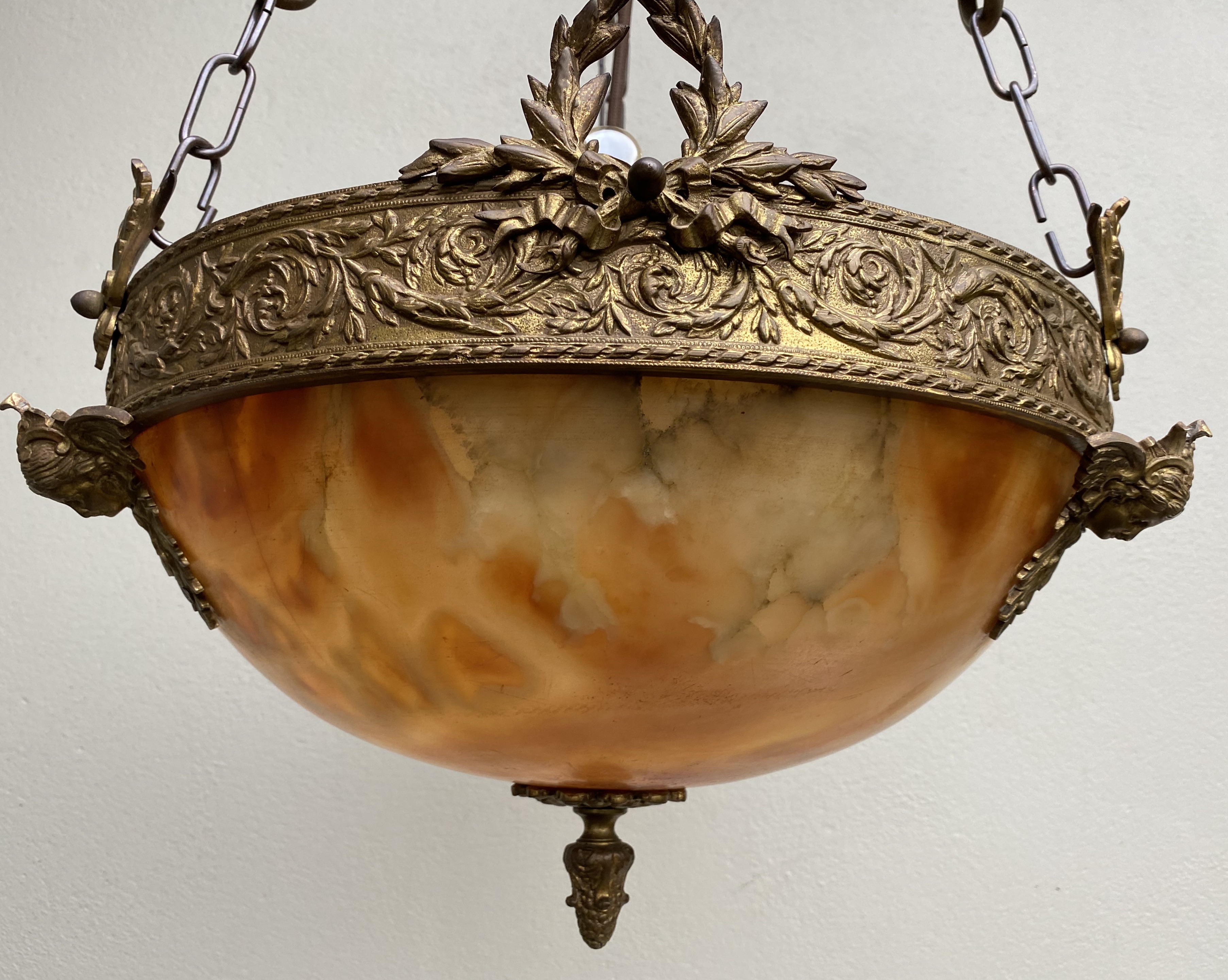 Ver\y impressive large 1930's French alabaster ceiling light shade with figural solid bronze mounts and fittings.