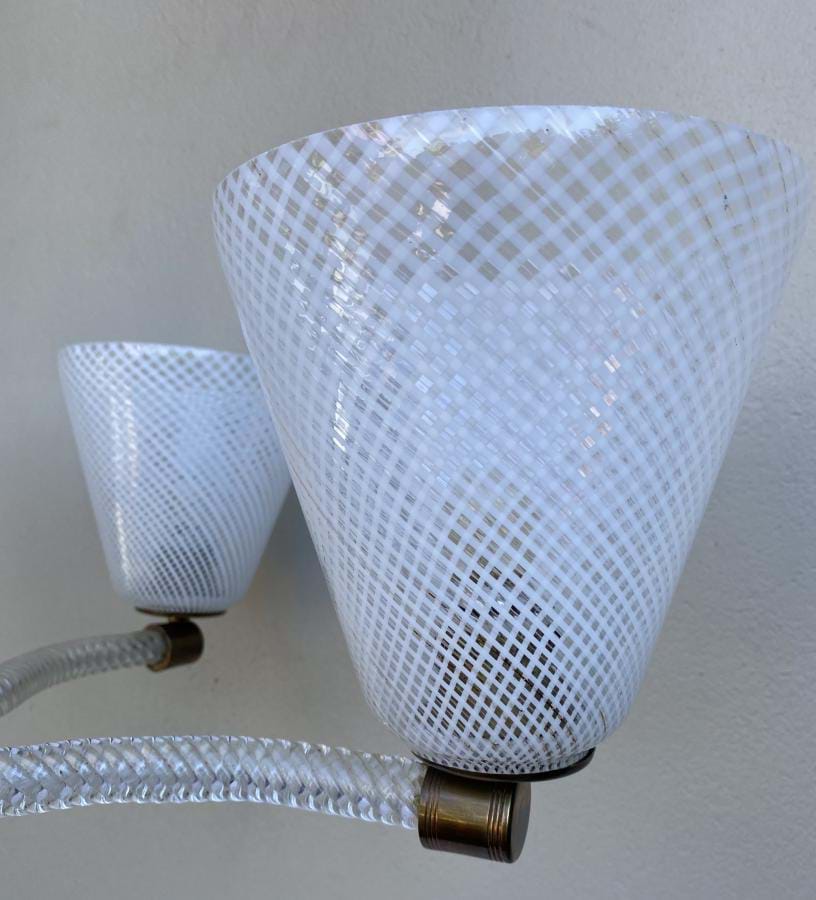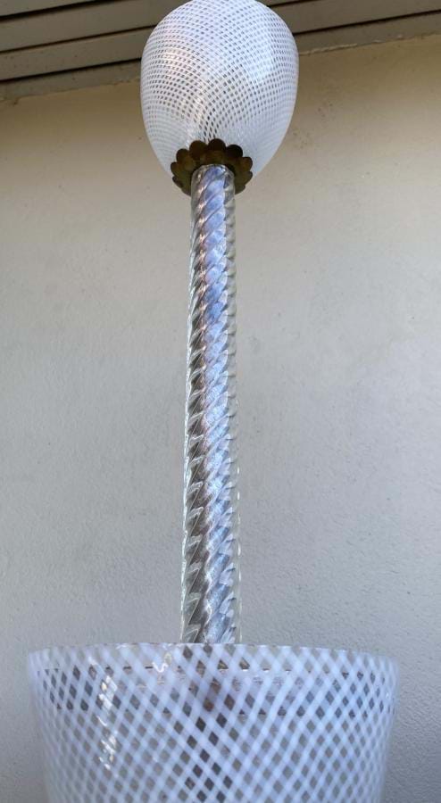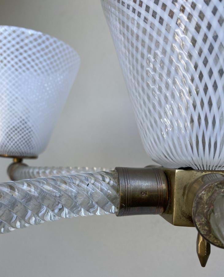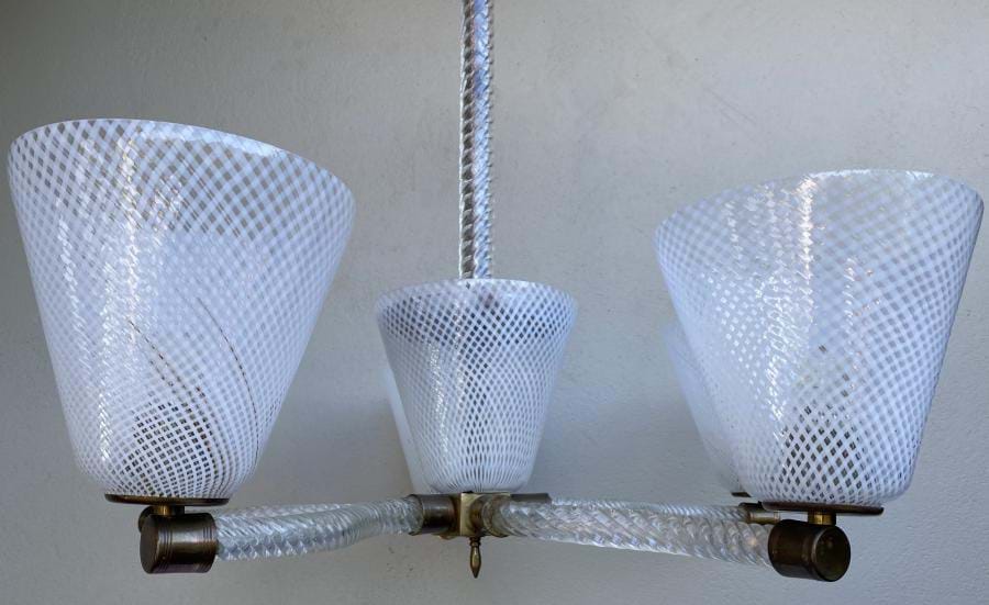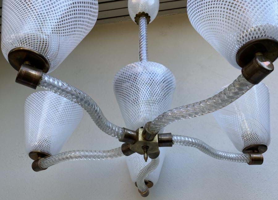 Beautiful large 1950's Italian Murano (Seguso?) 5 light chandelier with brass fittings and curved hand blown rope arms, complimented by latticino clear/off white shades and centre pieces. Chandelier is in excellent condition and has been fully re-wired. This fixture has great presence and style! Measures 700mm wide and has an overall length/drop of 620mm. Ceiling cap is 110mm across.