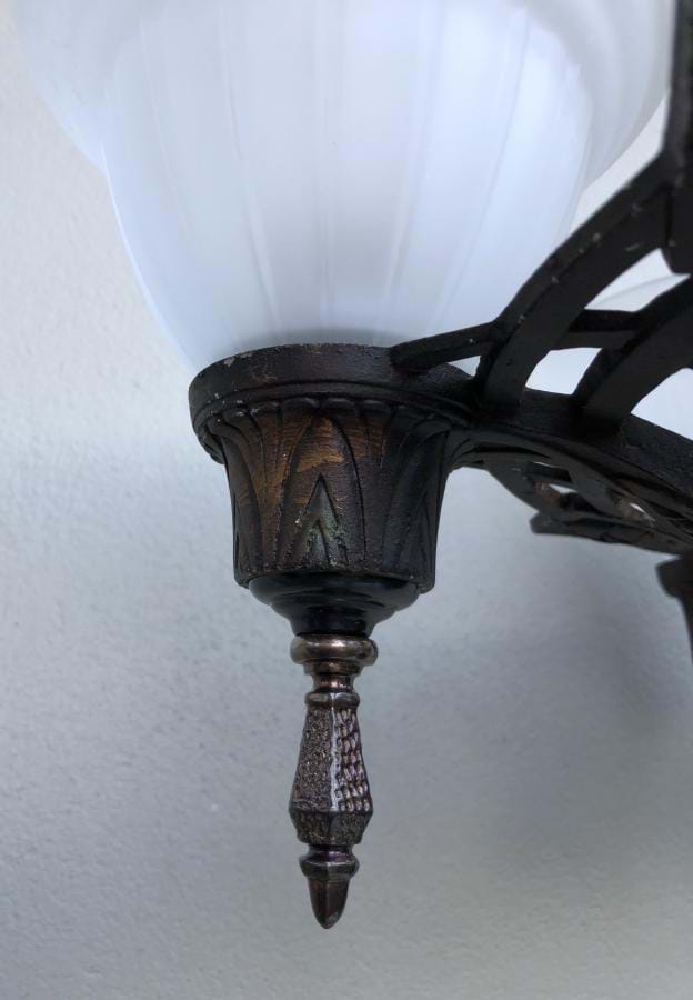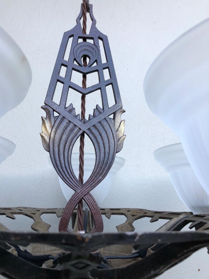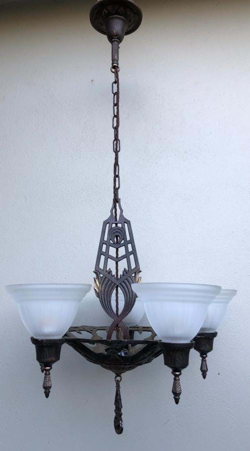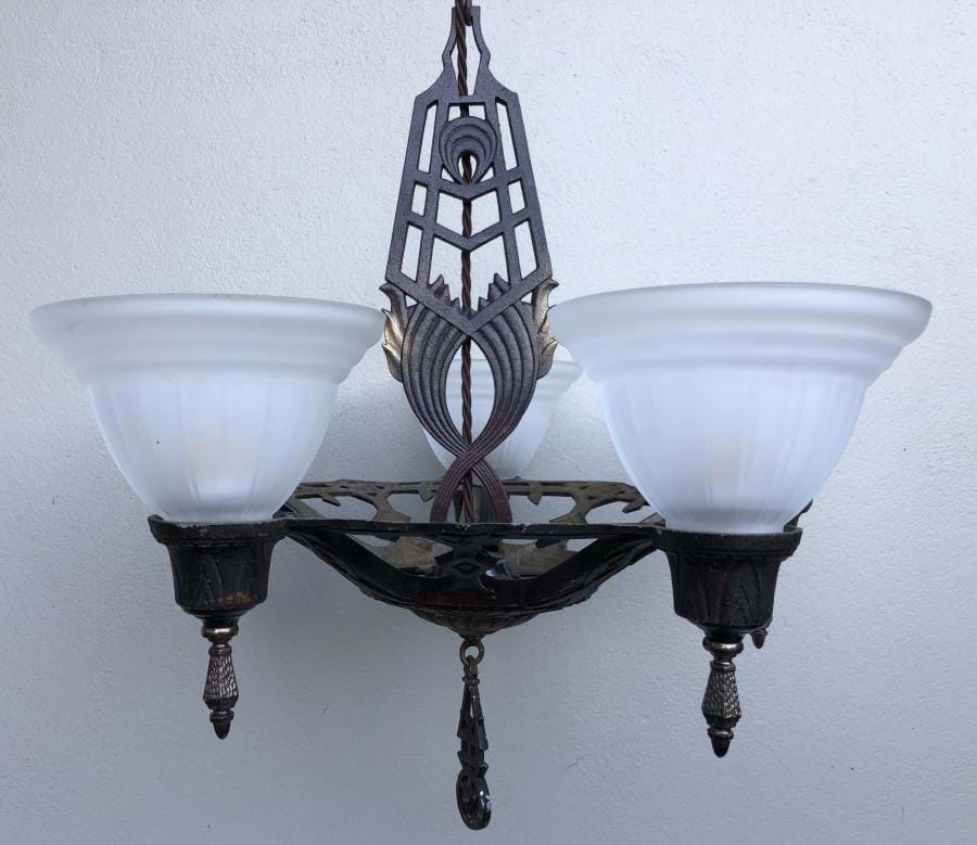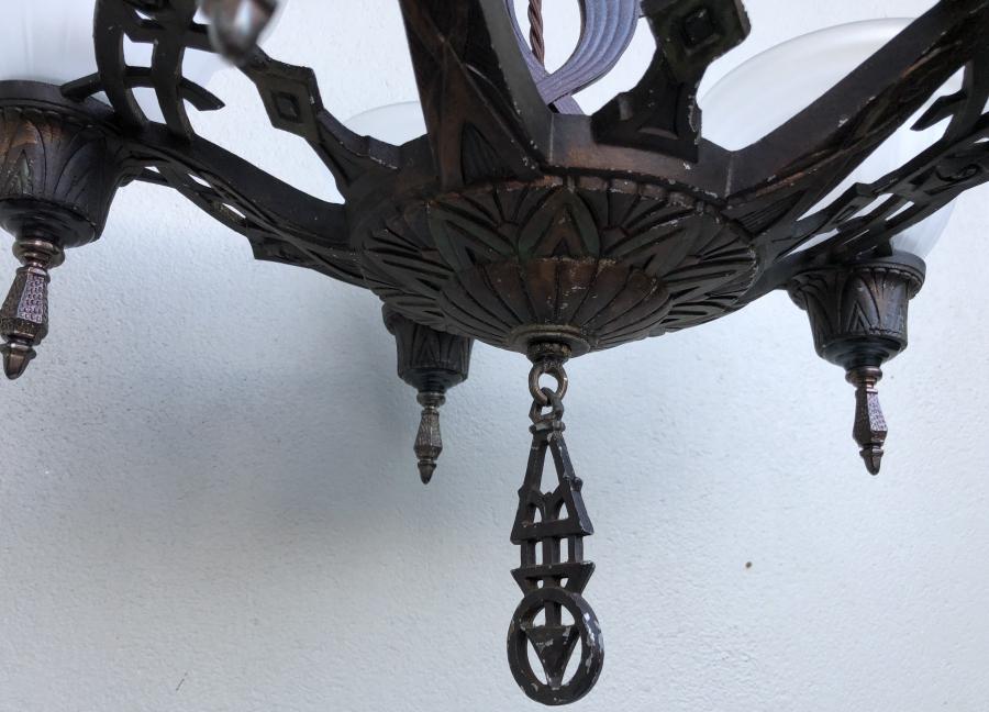 Fixture retains its original dark bronze polychrome finish and has a great Deco design!