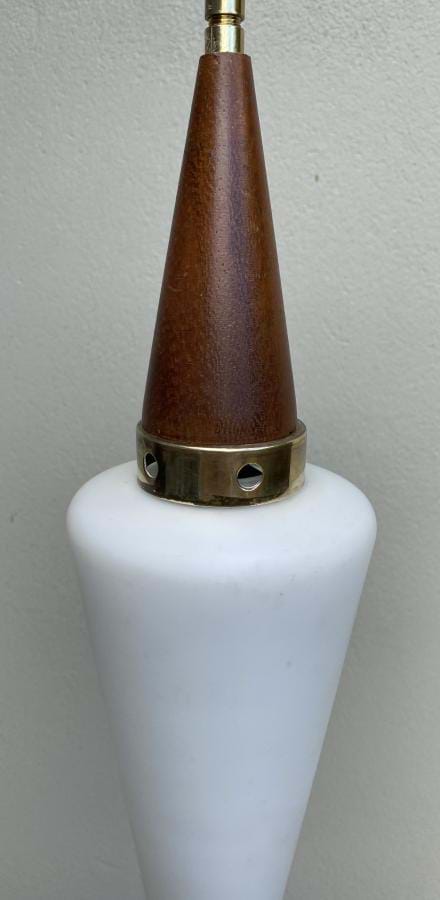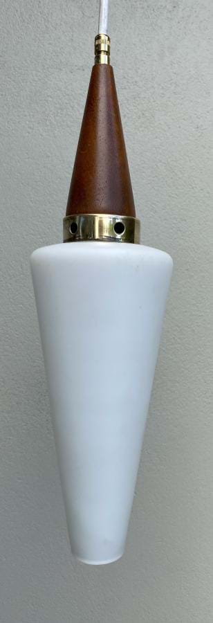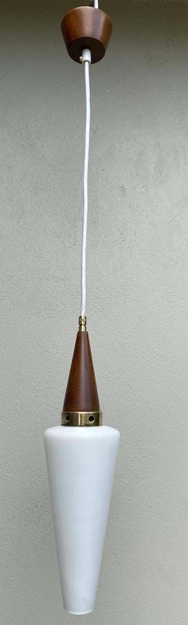 Very stylish 1950's Danish teak and brass pendant light with its original white tapered glass shade. Fully re-wired and in excellent condition. Shade is 400mm long (from top of teak cone to base of shade) by 110mm at its widest. Overall length/drop (adjustable) is approx. 850mm. Teak ceiling cap is 90mm across.