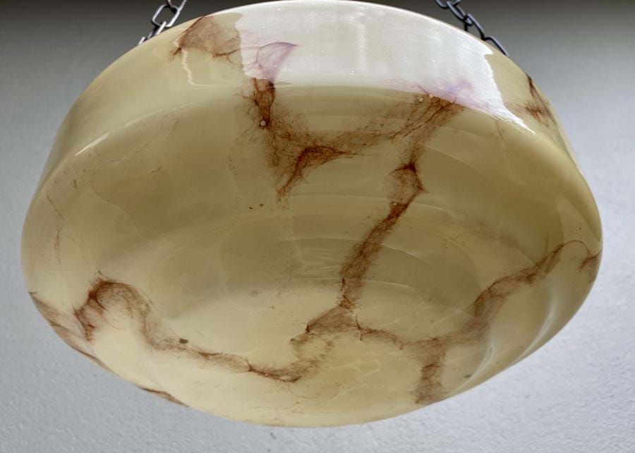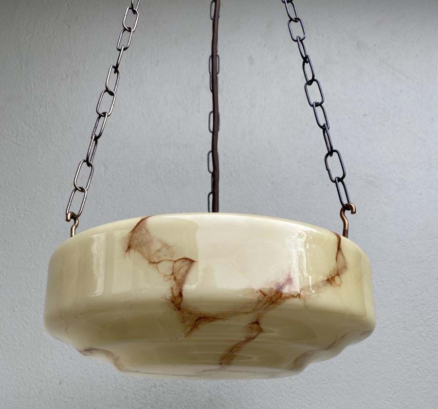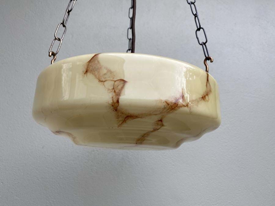 Great pair of matching 1930's stepped cream glass ceiling light shades with brown veining. Shades come with re-wired 3 chain suspension fittings and are ready to hang. each is 300mm wide and the overall length/drop (adjustable) is approx. 800mm. Price shown is for the pair. Single price is $445