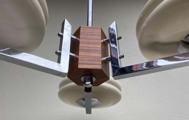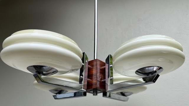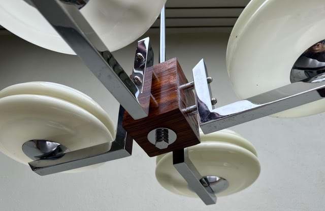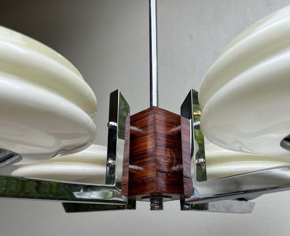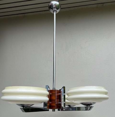 Great 1930's Deco chrome and timber 4 light chandelier with angled arms and original moulded cream glass shades.