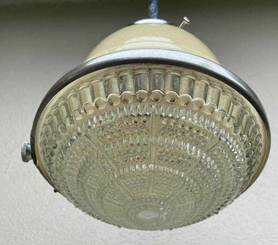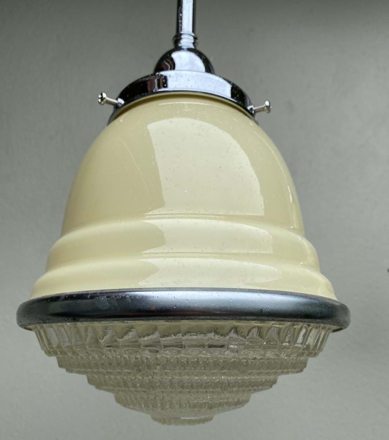 Nice pair of small 1930's moulded cream glass shades with clear prismatic glass bases (held in place with a chrome ring). Each comes with chrome rod suspension fittings and are ready to hang. Would look great over a kitchen bench! Shades are 150mm long by 160mm wide and the overall length/drop is 700mm....which can be altered if requested. Price shown is for the pair.