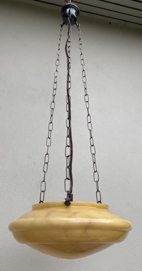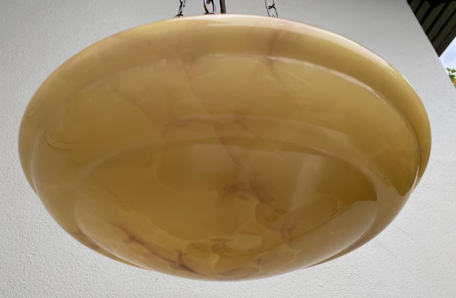 1930's Czech deco moulded yellow glass ceiling light shade with brown veining.....great shape!....akin to a flying saucer! Shade comes complete with re-wired 3 chain suspension fittings and is ready to hang. Measures 300mm wide and the overall length/drop (adjustable) is approx. 800mm.
