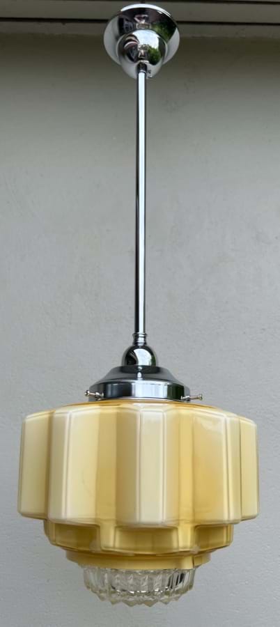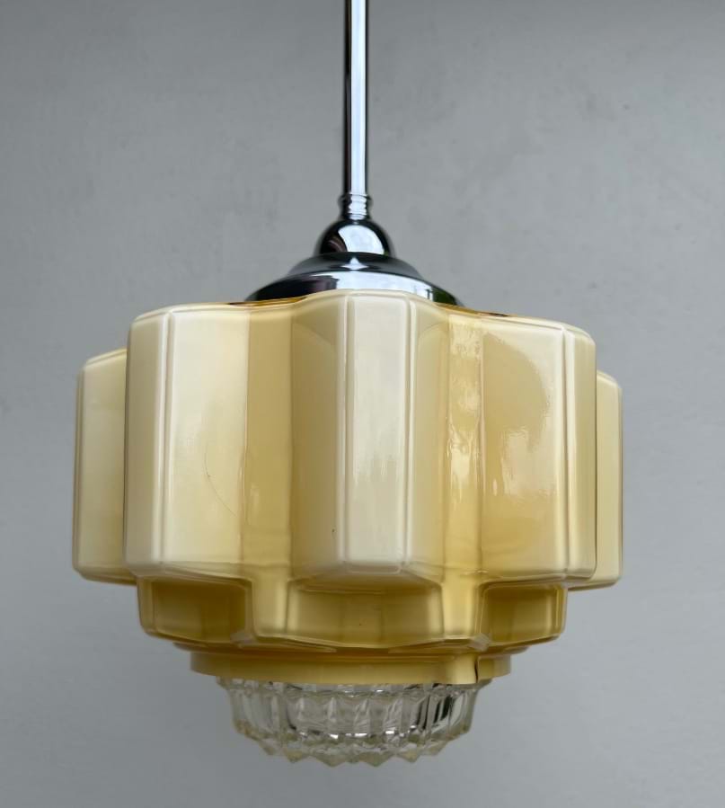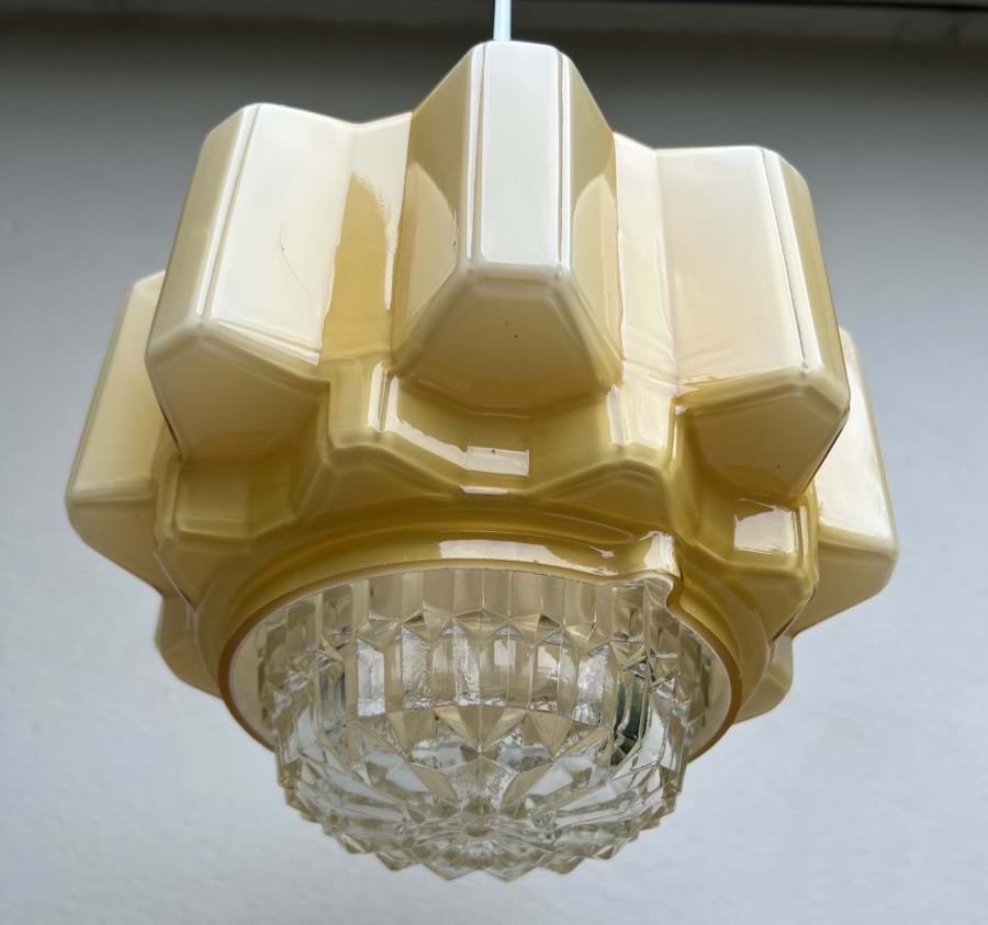 A great 1930's Deco cream/yellow glass 'cogwheel' ceiling light shade with clear prismatic glass base.