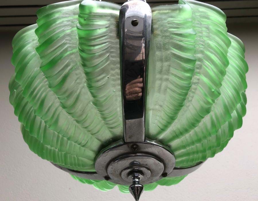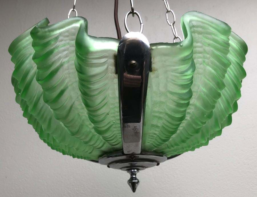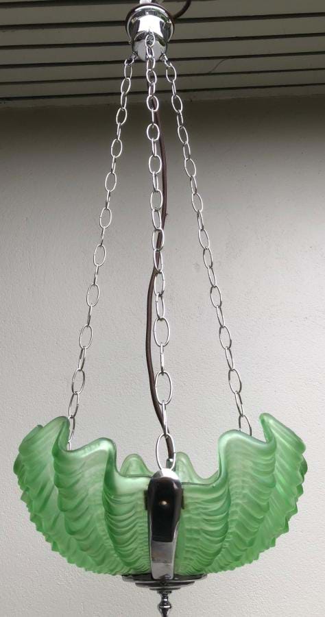 Striking 1930's English deco chrome and green glass clamshell ceiling light. Comes with re-wired chrome 3 chain suspension fittings and is ready to hang. Shade is 330mm wide and the overall length/drop (adjustable) is approx. 800mm.