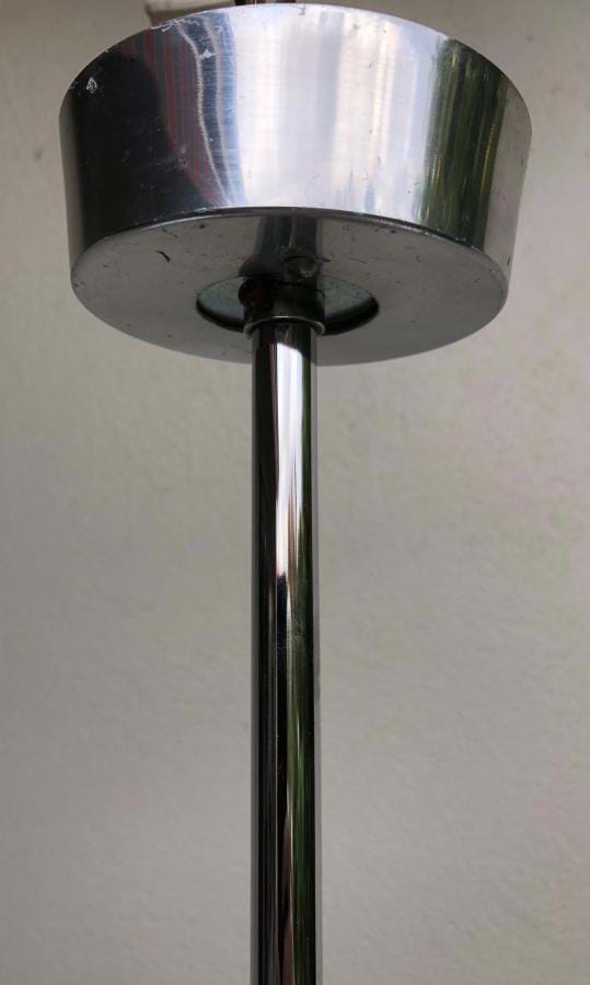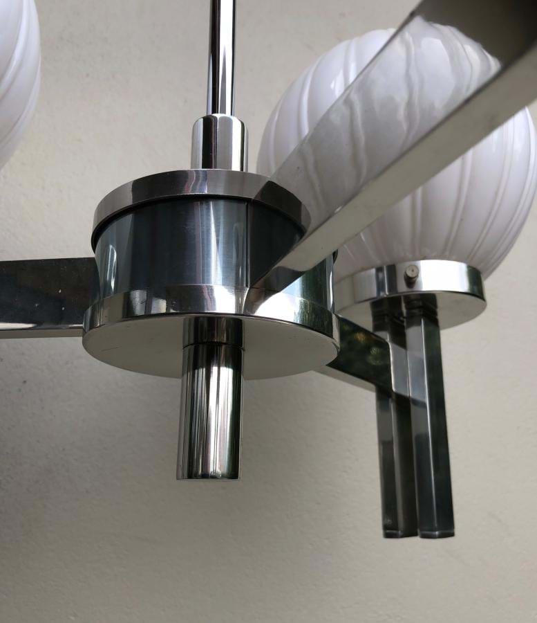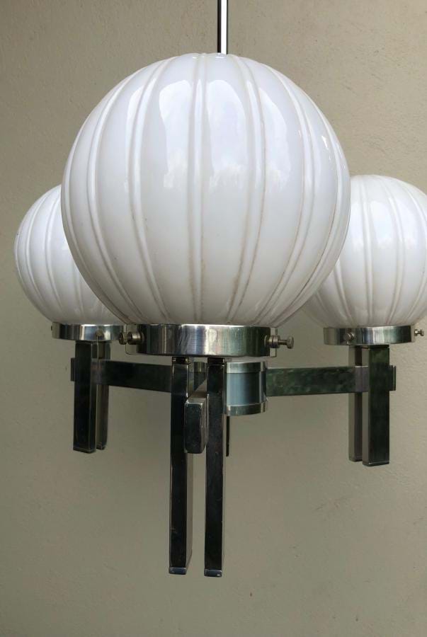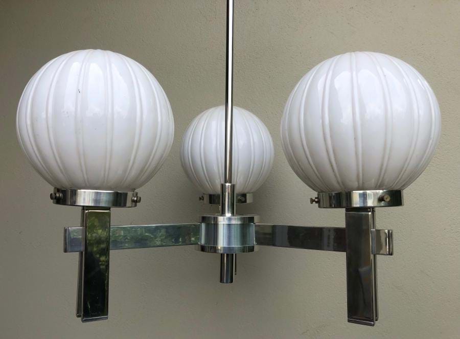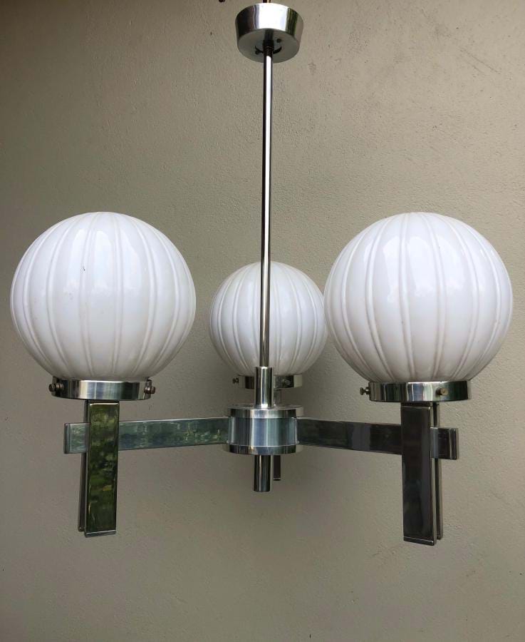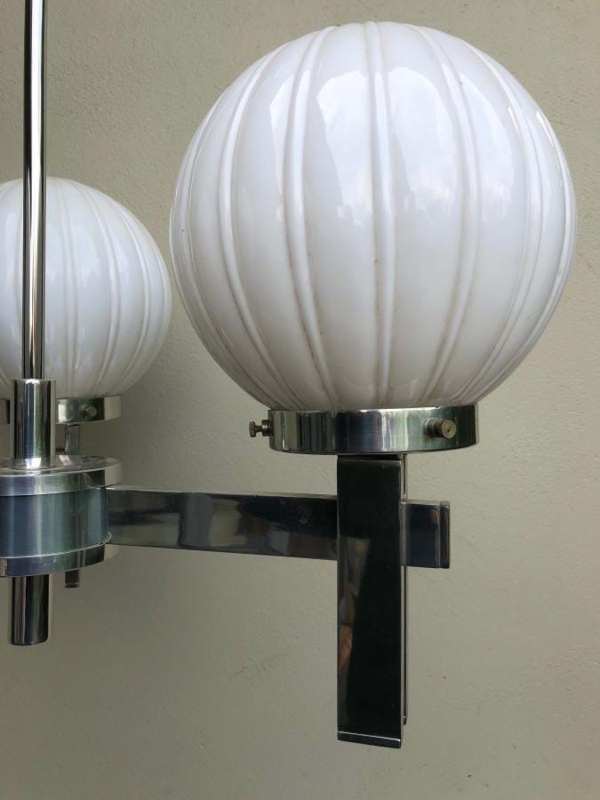 Original....and rare.... chrome deco/modernist 3 light chandelier made by Phillips (Netherlands). Fixture has a great design and comes with original white ribbed spherical glass shades. Fully re-wired. Measures 500mm wide and the shades are 200mm across. Overall length/drop is 650mm (which can be altered if requested). Ceiling cap is 90mm across.