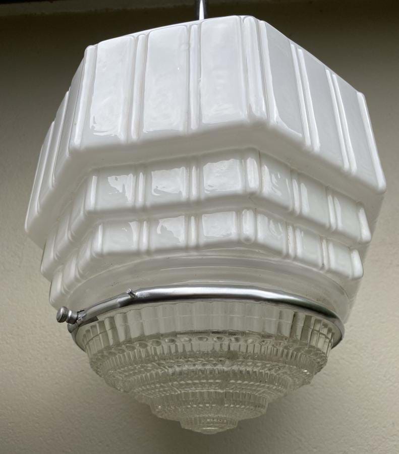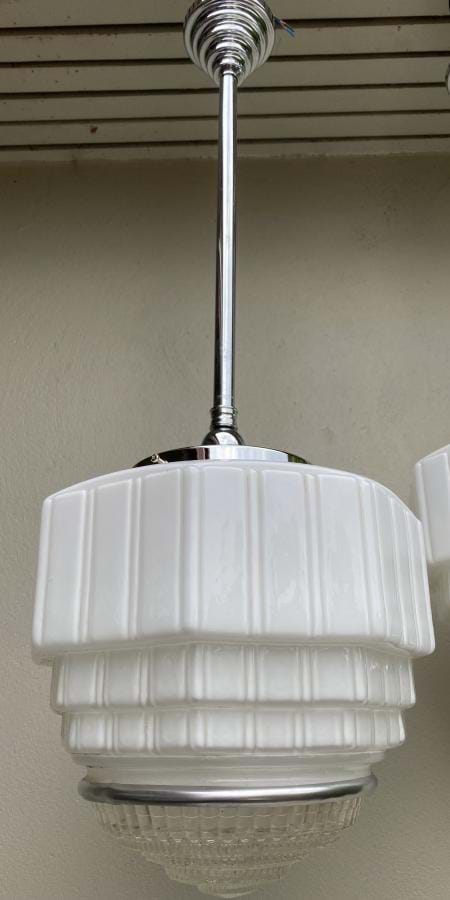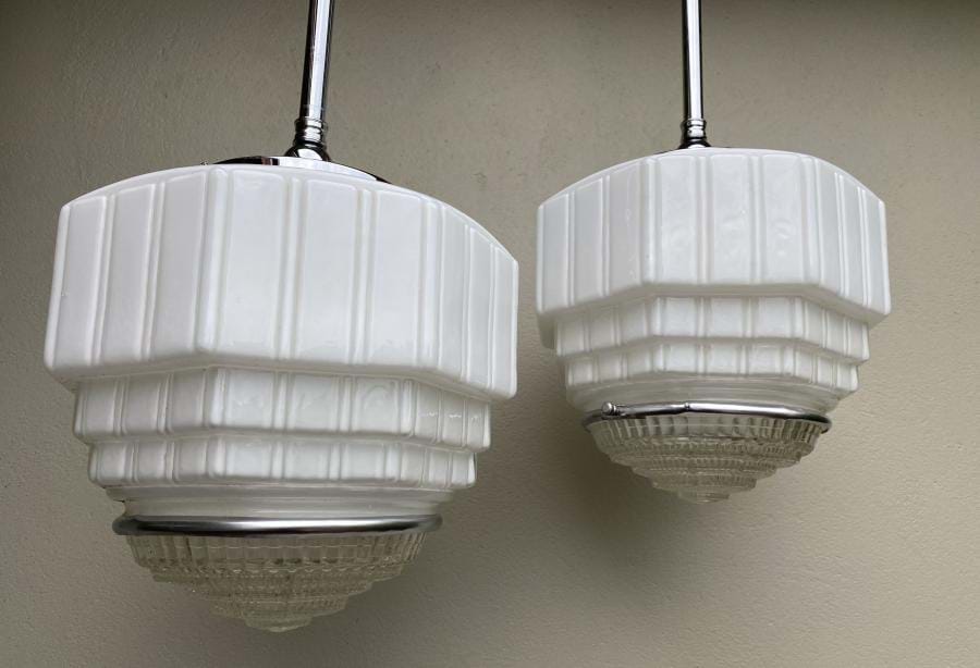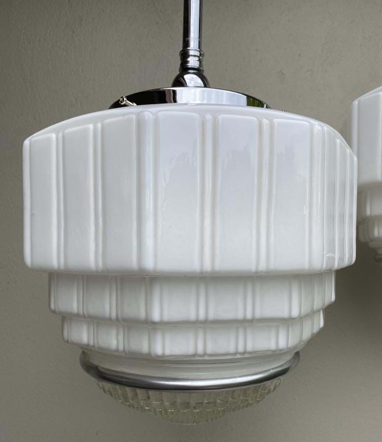 Great pair of large 1930's moulded white glass skyscraper shades with clear prismatic glass bases (held in place with removable chrome bands). Shades are in excellent condition and come complete with chrome rod suspension fittings (dark bronze fittings also available if preferred). Shades are 300mm wide by 250mm long and the overall length/drop is 820mm....which can be altered if requested. Price shown is for the pair. Single price $865