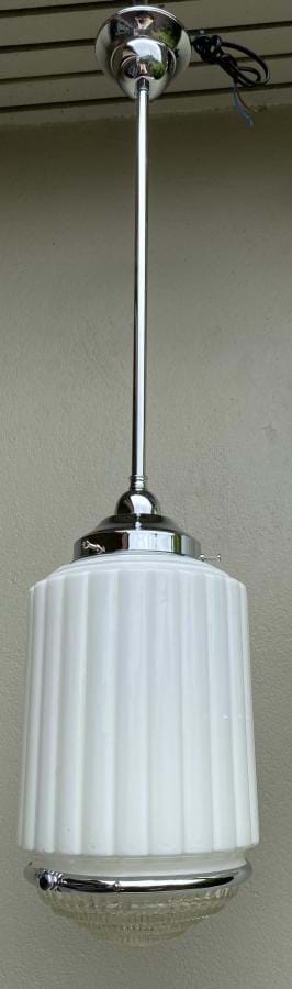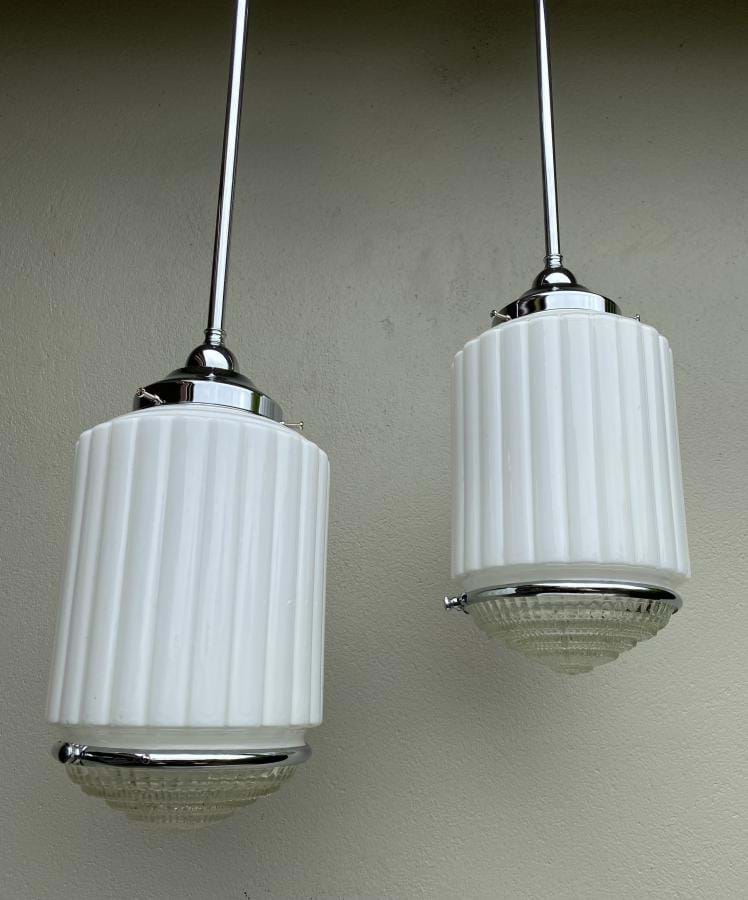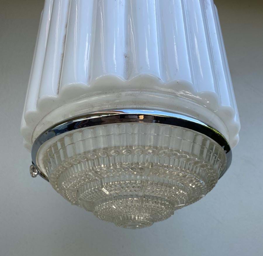 Original 1930's deco white ribbed glass ceiling light shades with clear prismatic glass bases....ideal for over a kitchen bench top or down a hallway! Matching pair are available and come with chrome rod suspension fittings (dark bronze fittings also available if preferred).