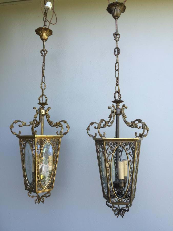 Fabulous large 1930's/1940's French cast bronze 5 sided lantern with clear/etched glass panes. This is of the highest quality and beautifully made. Takes 3 globes and has been fully re-wired. Comes with original decorative suspension fittings. Lantern is 585mm long by 360mm wide and the overall length/drop (adjustable) is approx. 1 metre. Note: ...Pictures show two lanterns.....but only one is available.