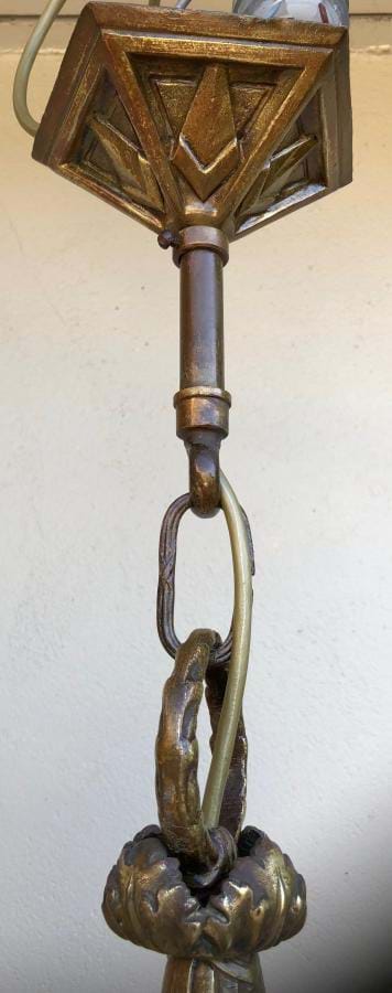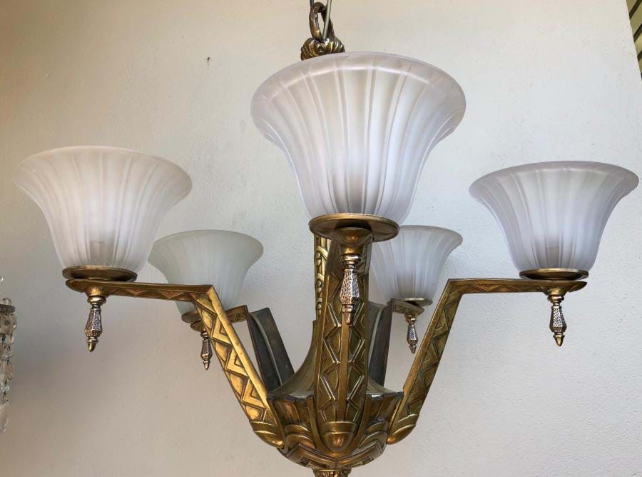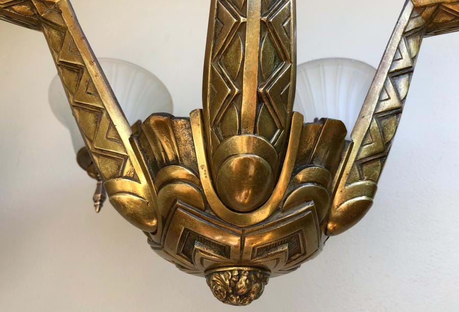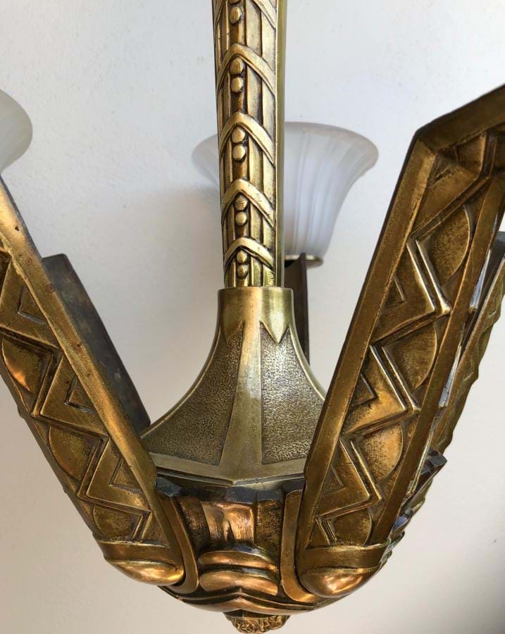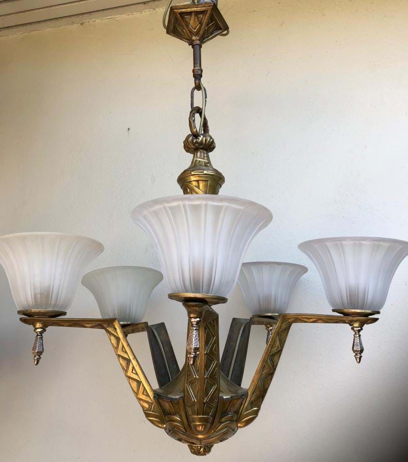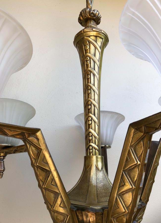 Superb 1930's French deco solid bronze 5 light chandelier with moulded/frosted glass shades. Fixture has wonderful deco cast details and has been fully re-wired. Measures 700mm wide and has an overall length/drop (adjustable) of 800mm. Cast ceiling cap is 120mm across.
