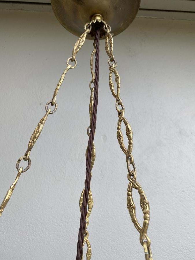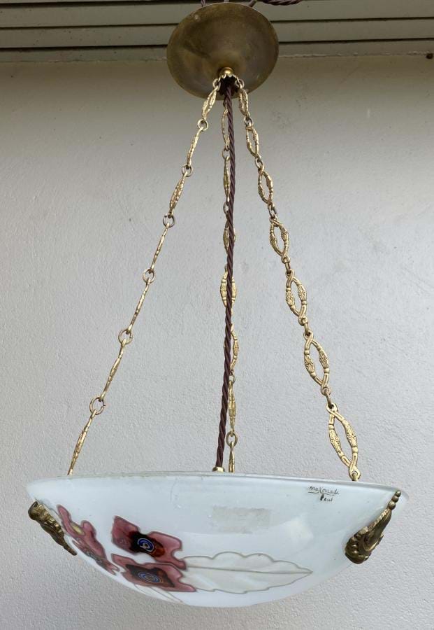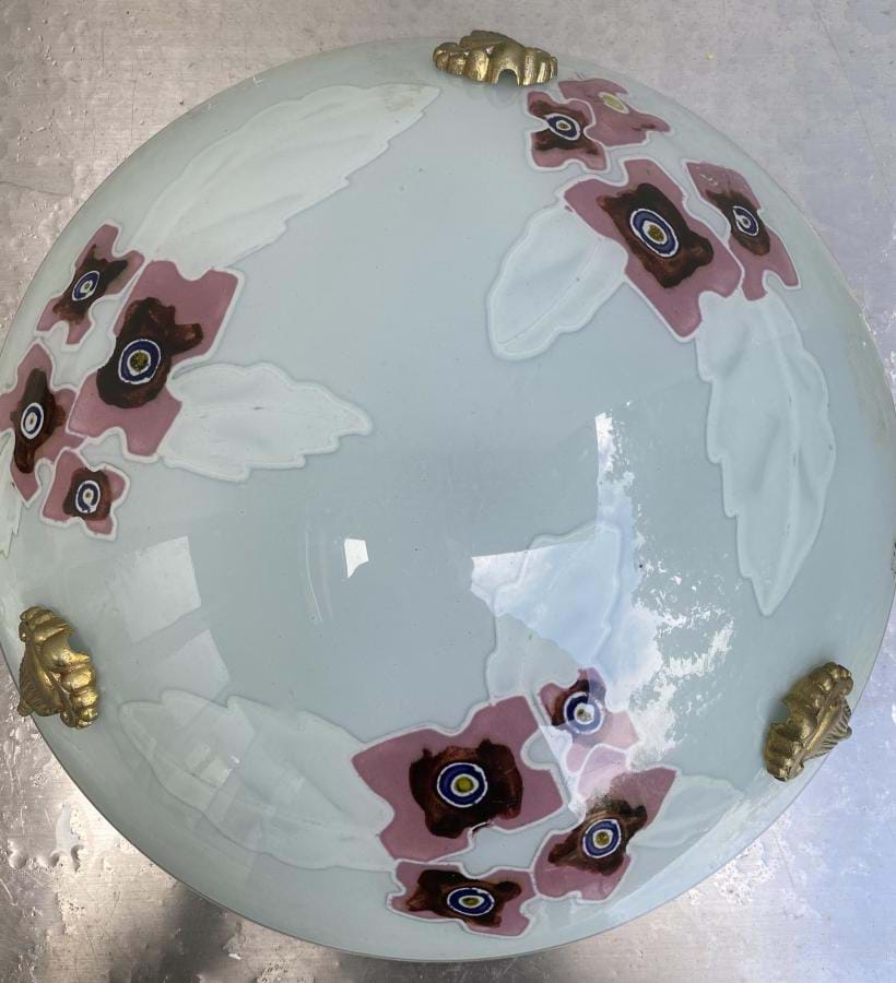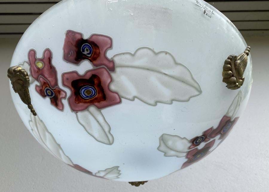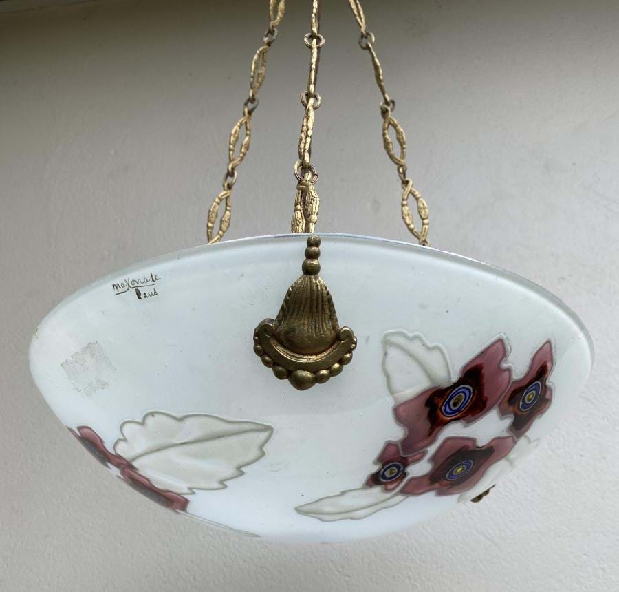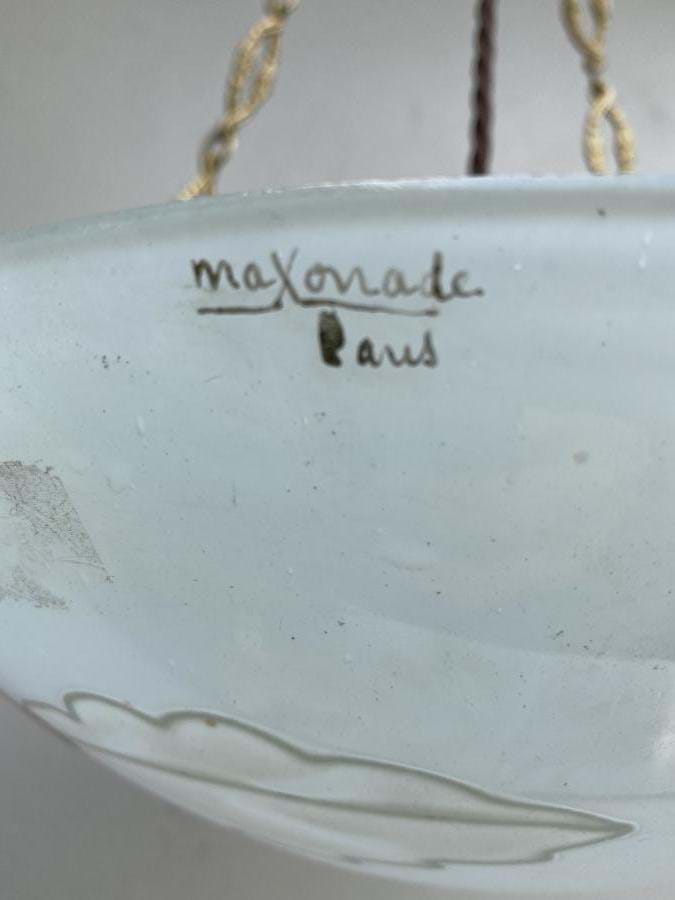 Beautiful 1930's French deco enamelled glass ceiling light shade by Maxonade (signed). Shade has a stylised floral/leaf design in lovely off white/mauve/purple colouring. Comes with re-wired original decorative brass suspension fittings. Shade is 330mm wide and the overall length/drop is 700mm.