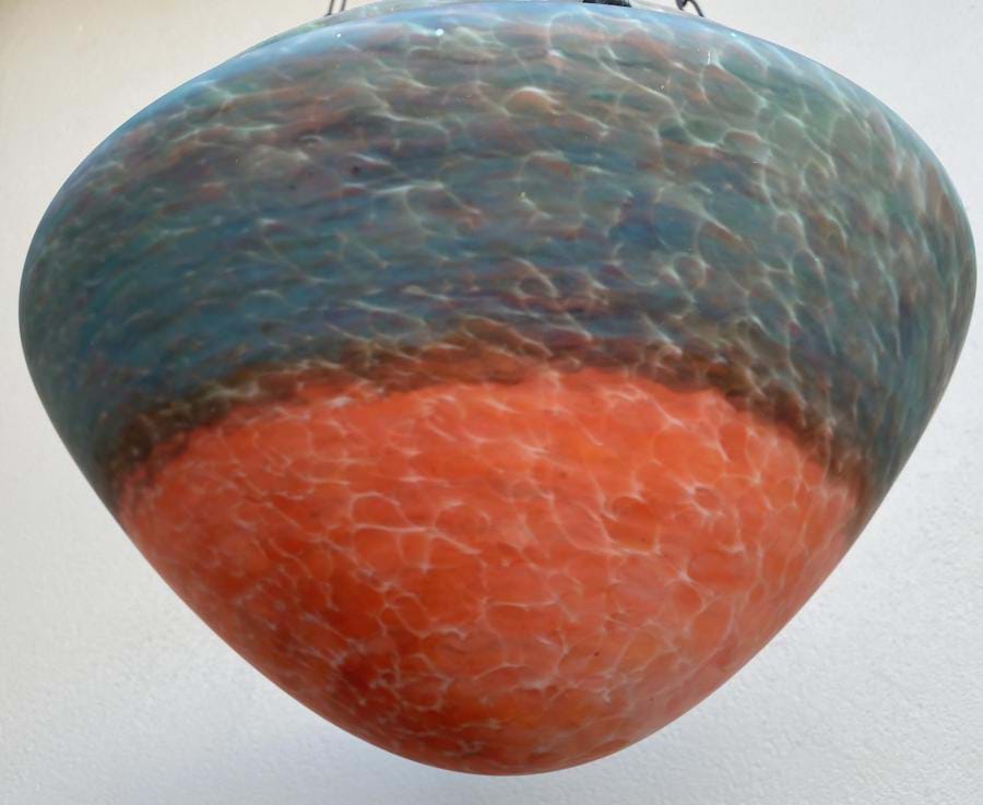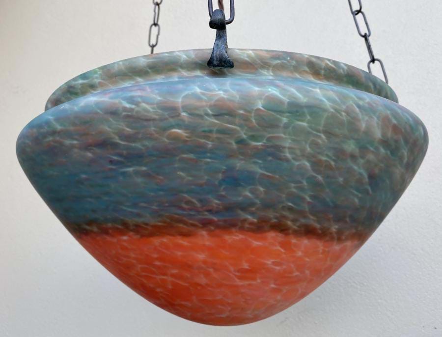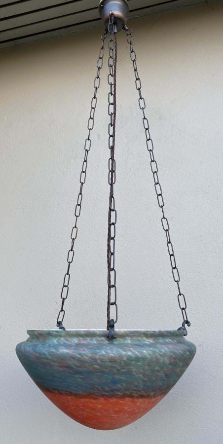 A large French Deco red/green glass ceiling light shade. Comes with re-wired 3 chain suspension fittings and is ready to hang.