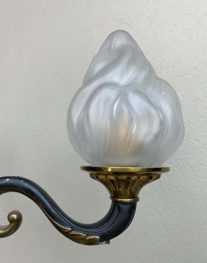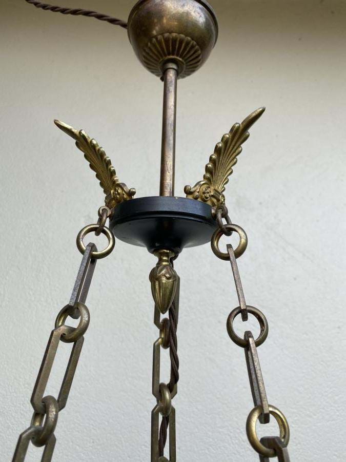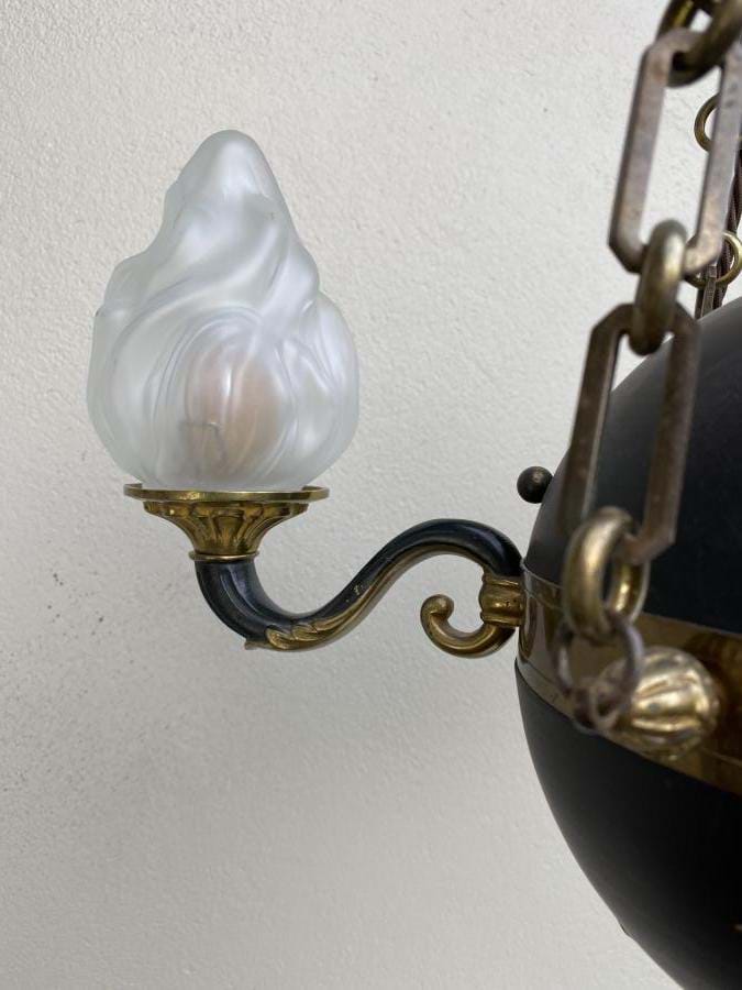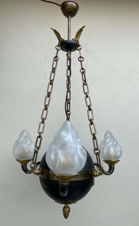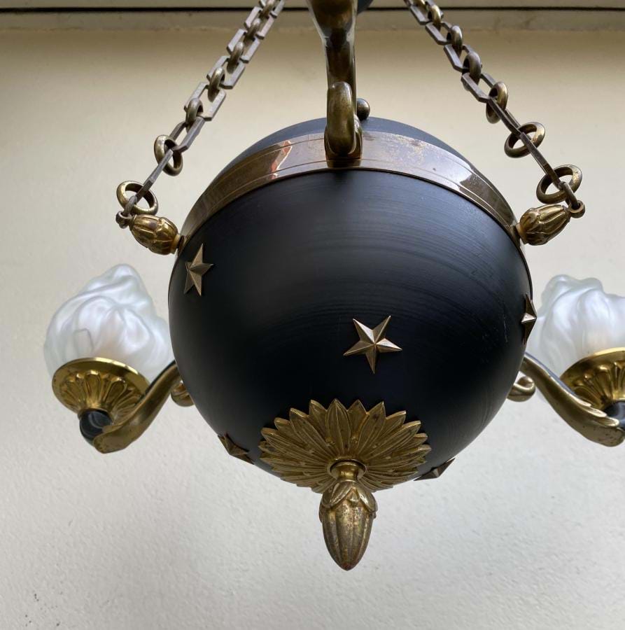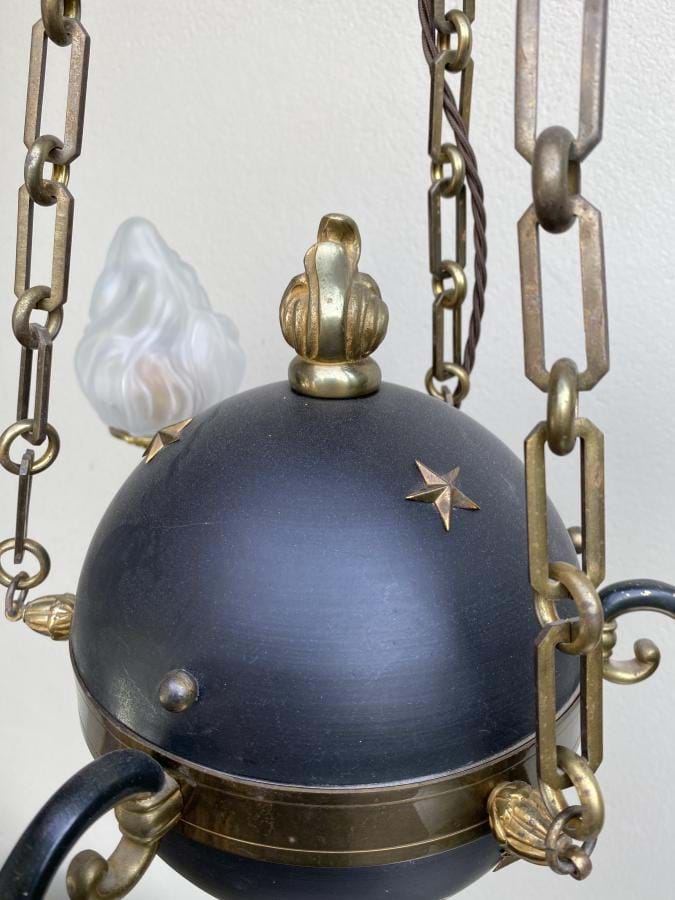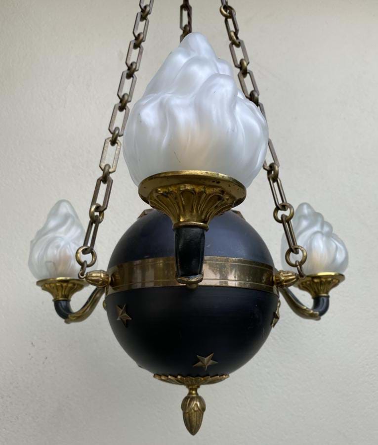 Fantastic 1940's/1950's French empire brass/black orb ceiling light with stars! Comes with its original decorative brass suspension fittings and clear/frosted glass flame shades. Fully re-wired. Measures 450mm wide and has an overall length/drop of 730mm. Centre ball is 200mm across.