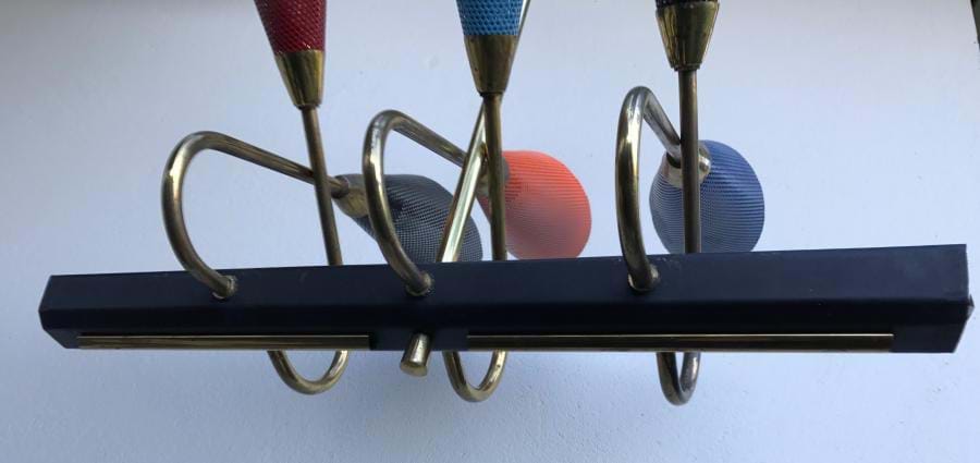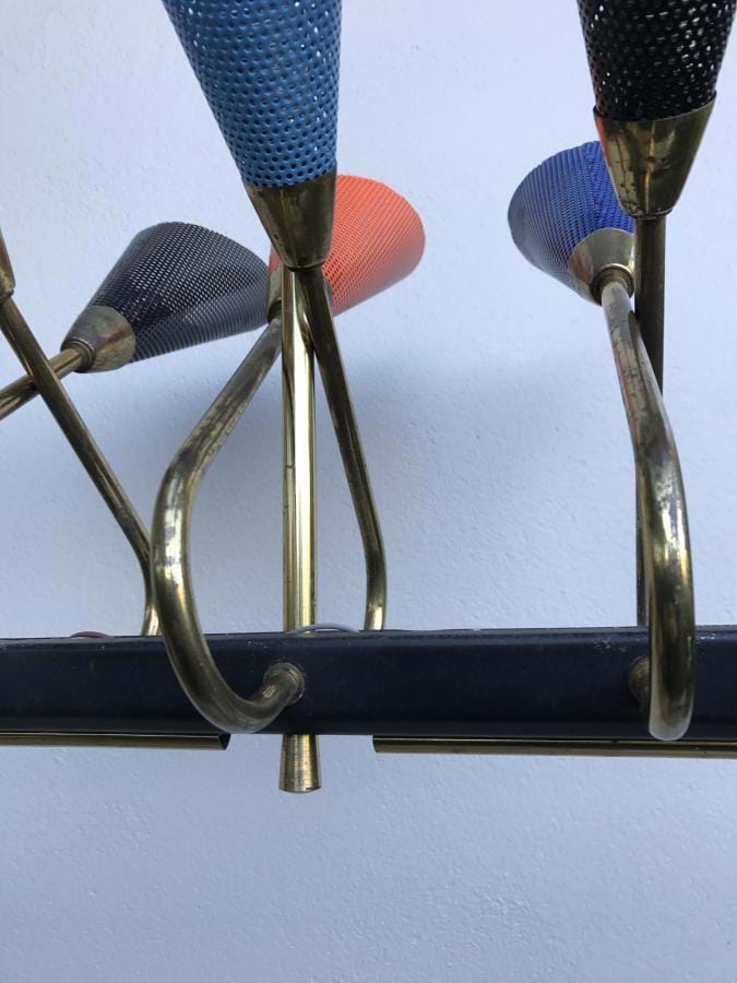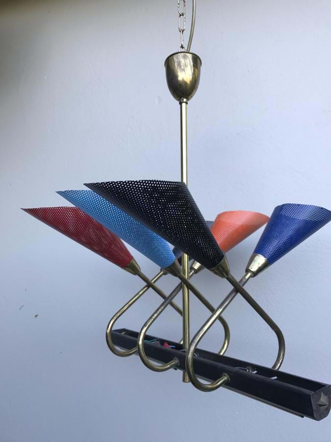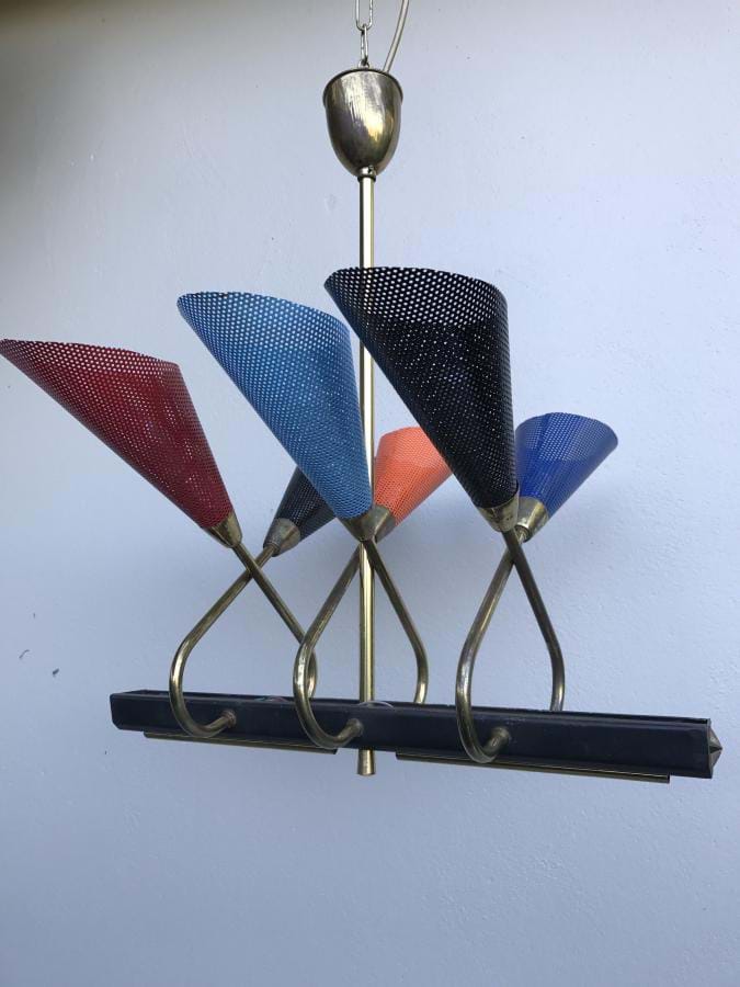 Great 1950's French brass/black 6 light chandelier by Mategot. Fixture has 6 perforated/coloured metal shades ....a design feature of Mategot's......seen in many of his designs....and has been fully re-wired. Measures 520mm wide and has an overall length/drop of 580mm. Ceiling cap is 70mm across.