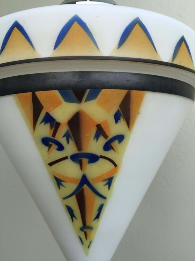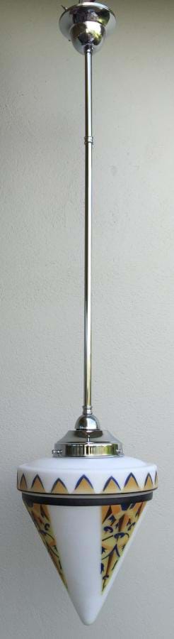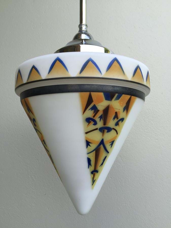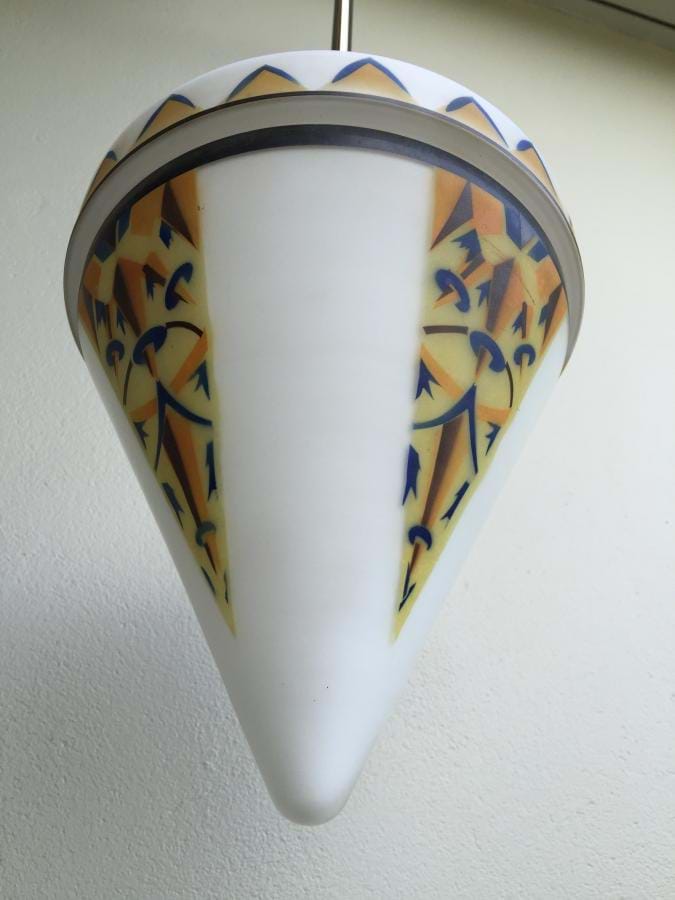 Original large 1930's German deco white conical glass light shade with abstract airbrushed design......great colours! Comes complete with chrome rod suspension fittings and is ready to hang. Aged brass rod suspension also available if preferred. Shade is 10 inches/255mm long by 8 inches/200mm wide and the overall length/drop is 39 inches/990mm (which can be adjusted). Ceiling cap is 4 inches/100mm wide.