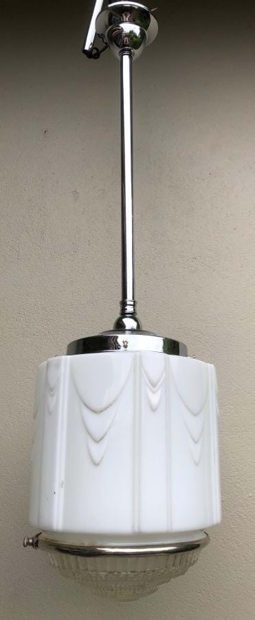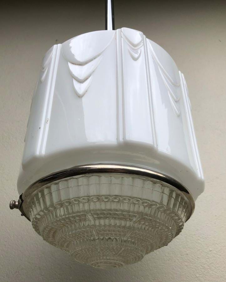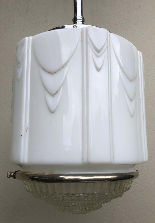 Large 1930's American Deco moulded white glass shade with nice design details and clear prismatic glass base.